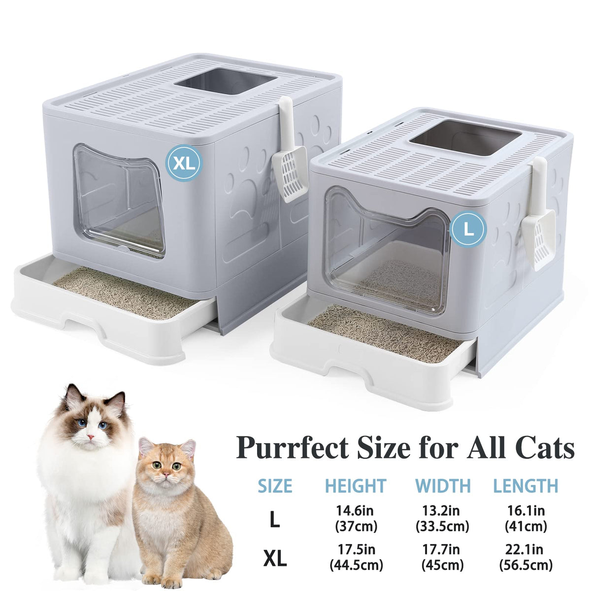 Bolux Foldable Cat Litter Box With Lid, Extra Large Litter Box With Cat Litter Scoop, Drawer Type Cat Litter Pan Easy To Scoop & Low Tracking (Grey Xl)