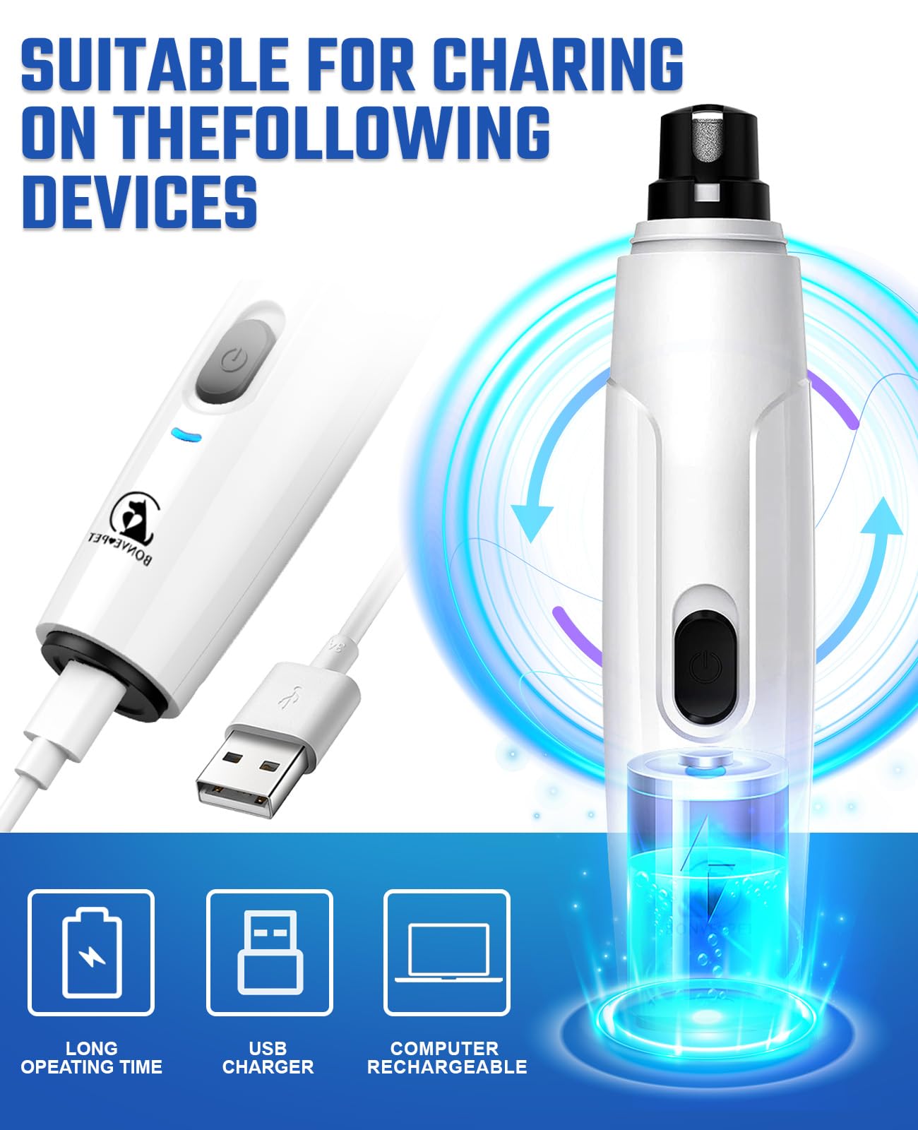 Q: How long does the battery last on the Bonve Pet Dog Nail Grinder?A: The Bonve Pet Dog Nail Grinder is USB rechargeable and provides up to 8 hours of continuous use after a 4-hour charge. This long-lasting battery makes it perfect for home use and professional grooming.