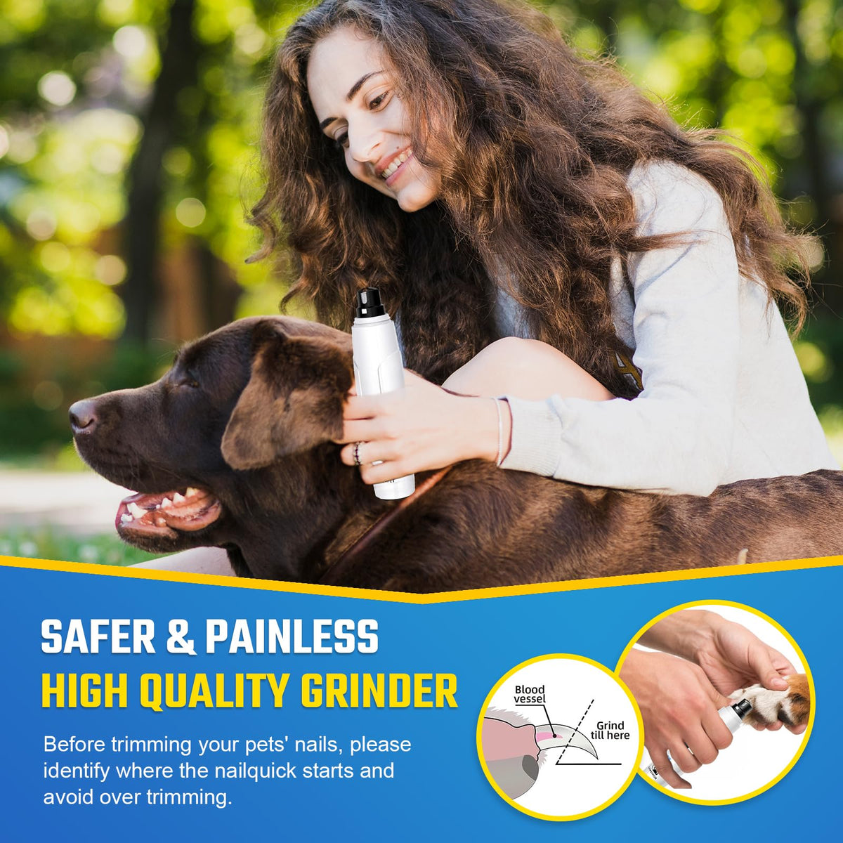 Q: Is the Bonve Pet Dog Nail Grinder safe for my pet?A: Yes, the Bonve Pet Dog Nail Grinder is designed with safety in mind. It operates at a low noise level of under 50dB to keep pets calm during grooming. Additionally, the grinder reduces the risk of over-clipping, ensuring a painless and precise trimming experience.