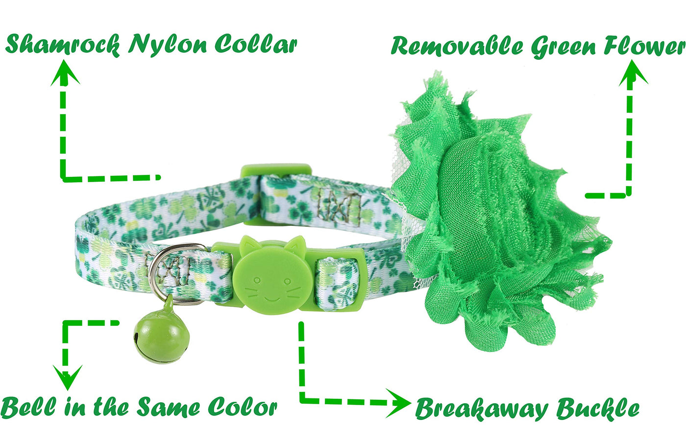 If You Are Looking For Some Designerl Cat Collars Or Unique Cat Collars With Bell, This Flower Shamrock Cat Collar Will Be Your Top Choice! With White Cat Collar Which Filled With Sharmrock Patten,With A Removable Green Flower Charm, Your Kitty Or Small Dogs Looks So Adorable And Elegent On Party Or Walk. You Pet Will Be Definately The Envy Of The Neighborhood And Friends! It Is Also A Perfect Gift For Pets And Pet Lovers As Pet Birthday, Wedding Or Holiday Costume Outfits.