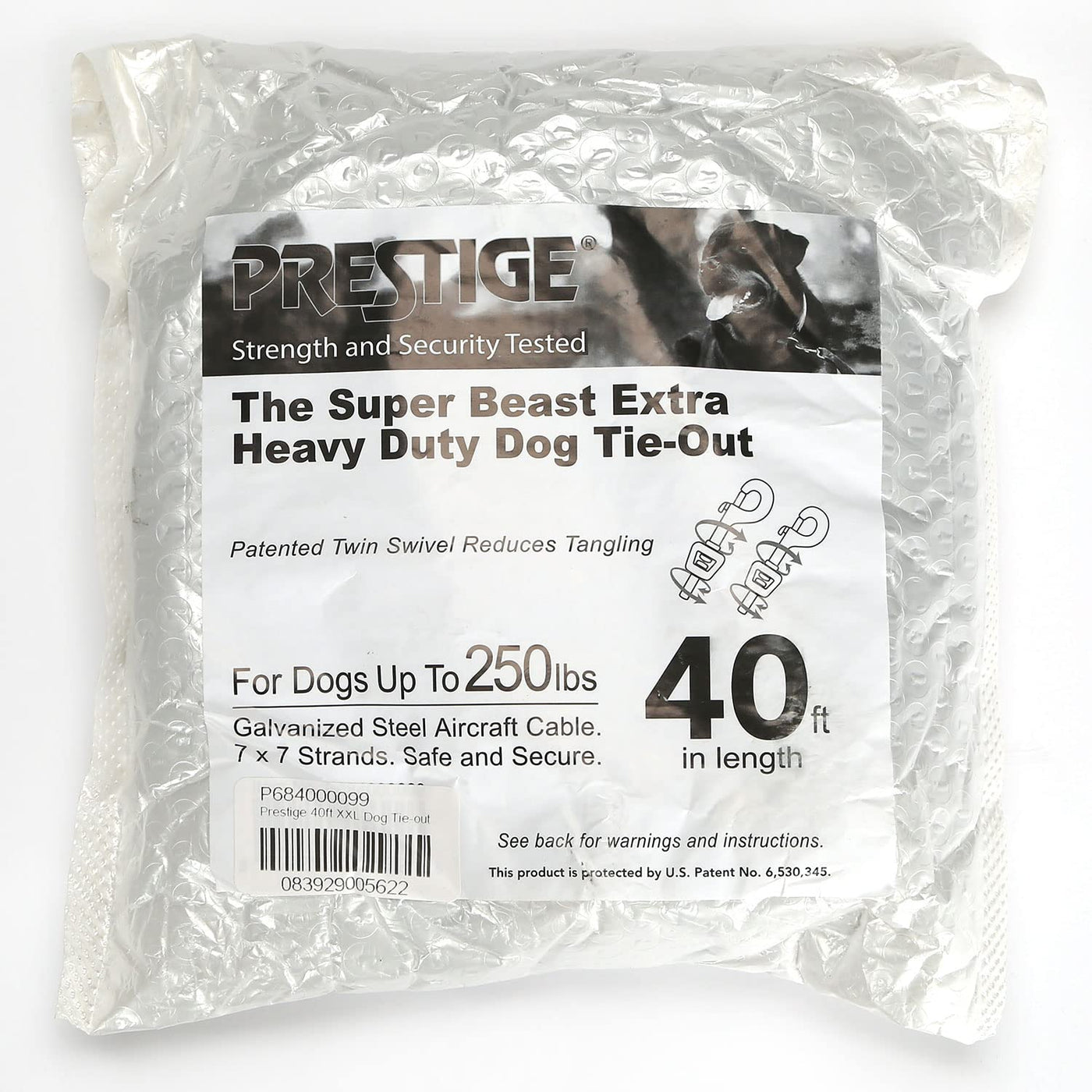 Feel A Sense Of Comfort Letting Your Dog Outside On Their Own While They Relax Or Play In The Cool Breeze With The 40-Foot Long Tie-Out Leash From Prestige. With Patented Twin-Swivel Snaps And A Direct-Connect System That Connects Snaps To Cabling, This Strong Tie-Out Is Virtually Tangle-Free To Keep Your Dog Comfortable Outdoors. An Extra-Extra-Long 40-Foot Cable Length Allows Your Dog To Have A Wide Area To Run Around While Still Staying Close To Home. The Metal Tie-Out Features A Premium Quality Comfort Snap To Protect Your Larger Dog'S Neck And Is Weight Rated For Larger Dogs Up To 250 Pounds. The Galvanized Metal Cable Is Coated In Durable Vinyl That Won'T Crack Or Fade From Prolonged Sun Exposure For A Worry-Free Finish. Built For Superior Strength And Holding Power, This Quality 49 Strand Cable Is Sure To Work Well After Years Of Outdoor Use. For A Durable Outdoor Tie-Out That Won'T Tangle, This 40-Foot Long Tie-Out Leash From Prestige Is Made With Your Large Dog'S Safety In Mind.