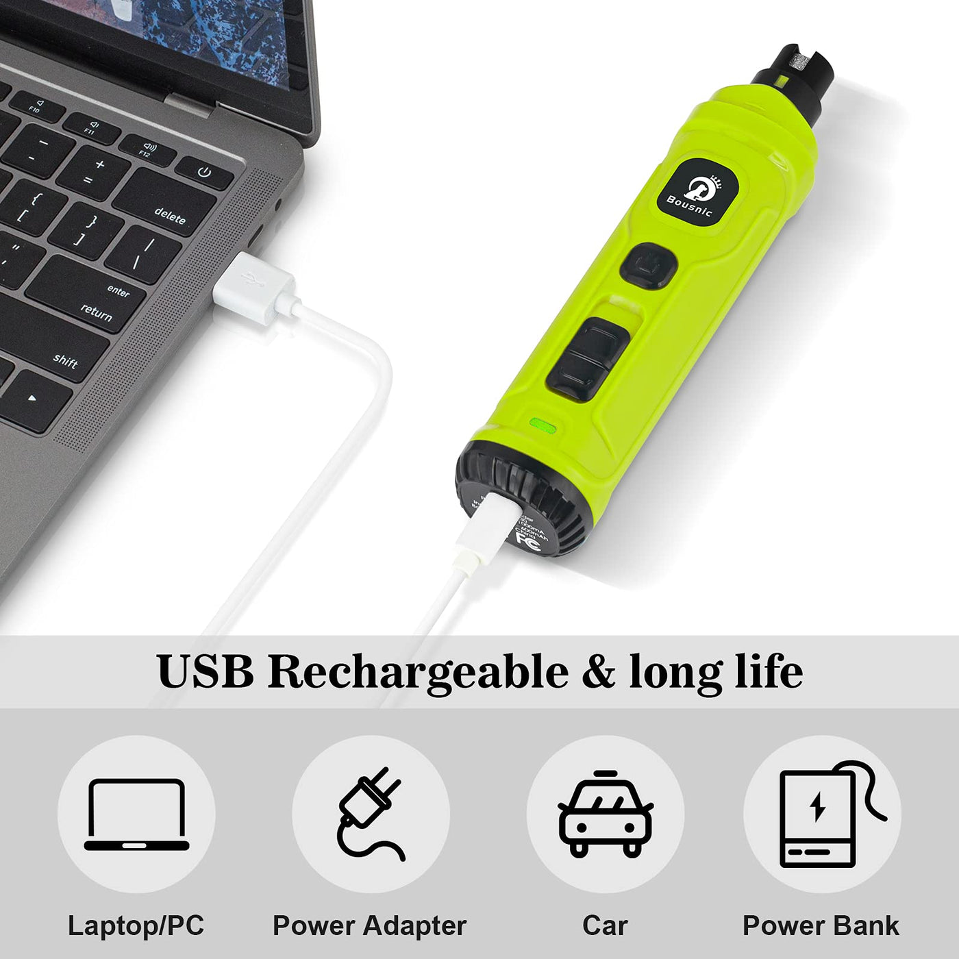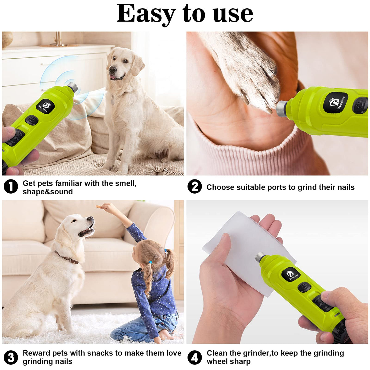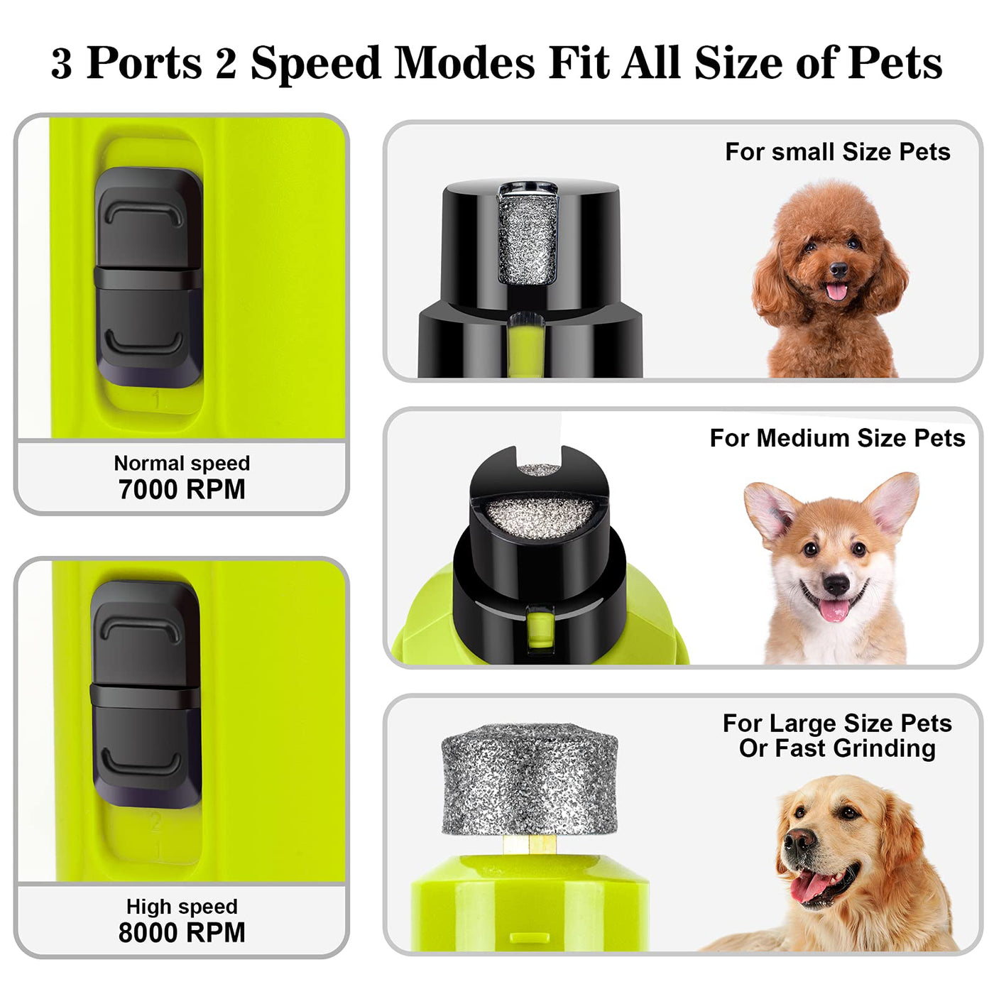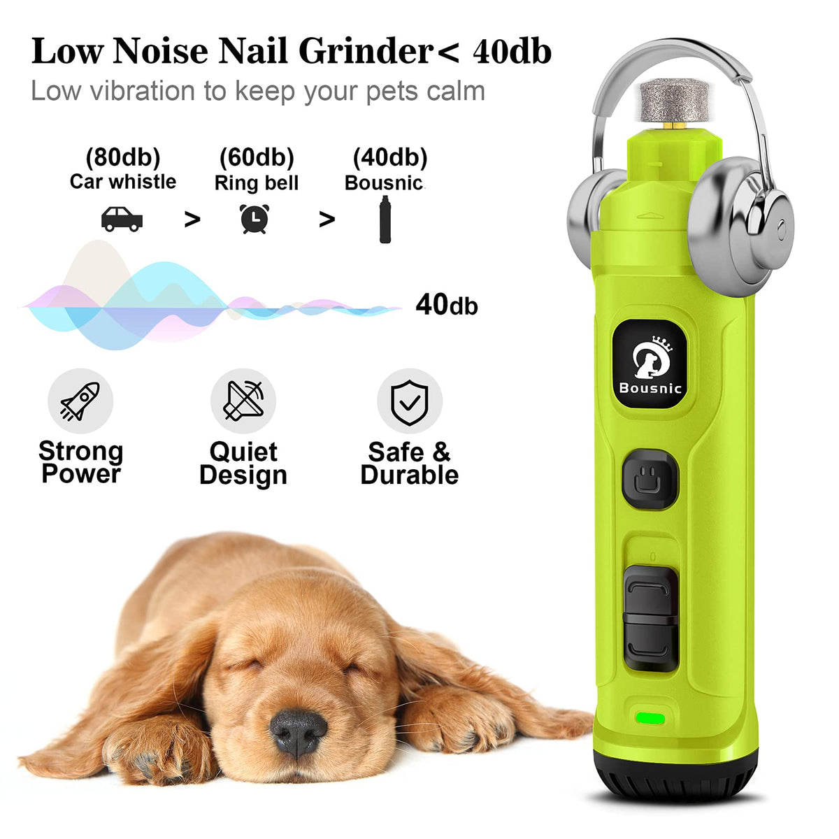 Upgraded Motor and 2 Running Speed Bousnic new grinder choose an upgraded higher quality motor The power has almost doubled than others This dog nail trimmer also features an adjustable low-high speed design powerful enough to support heavy grinding Helpful 2 LED Lights Our dog toenail grinder has dual LED lighting this is an exclusive design It helps you see claws clearly and prevent over-grinding or cutting You can press the light button to turn it onoff And this trimmer is lightweight and ergonomic very easy to use Quiet & Low Noise Exclusively using a high-quality motor the torque is controlled to 40 dB while boosting the torque Let the puppy and small animals no longer be disturbed by the noise the large breed nail care is no longer strenuous Rechargeable & Portable Our cordless dog nail grinder comes with a USB cable for charging it can last 2 hours after a 3-hour charge The lightweight and portable design make it easy to maneuver the electric file grinder tool to every corner of the paw it Any Size Pets This device features powerful 2 rotation speed and 3 grinding holes design making it suitable for any size of pet nail and keeping the dogAs comfort in check choosing an appropriate port and speed according to your pets size and nail hardness