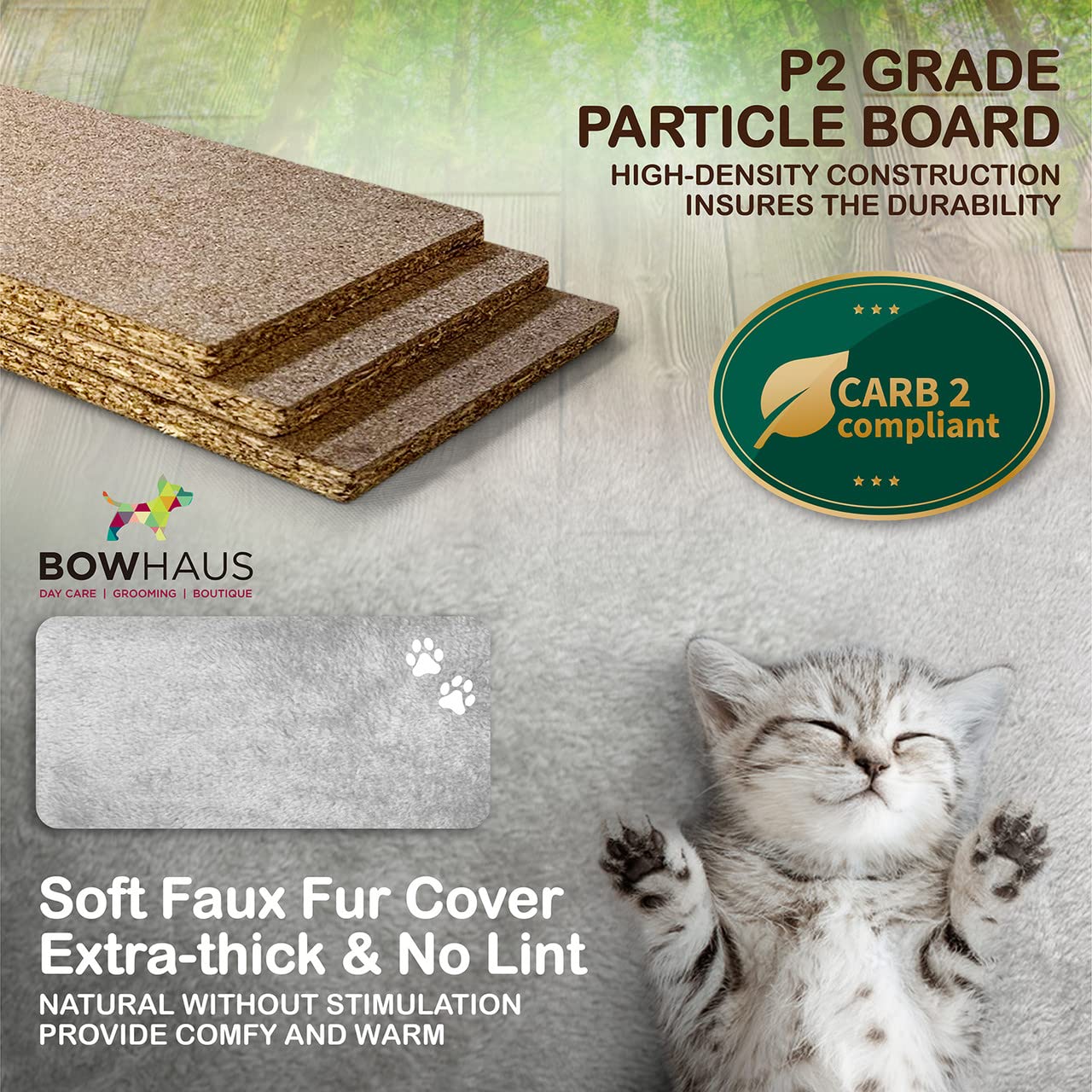 Q: What materials are used in the BOWHAUS Tall Cat Tree?A: The cat tree is constructed with P2 grade particleboard, durable plush covering, and wear-resistant sisal for the scratching posts, ensuring a safe and comfortable environment for your cats.