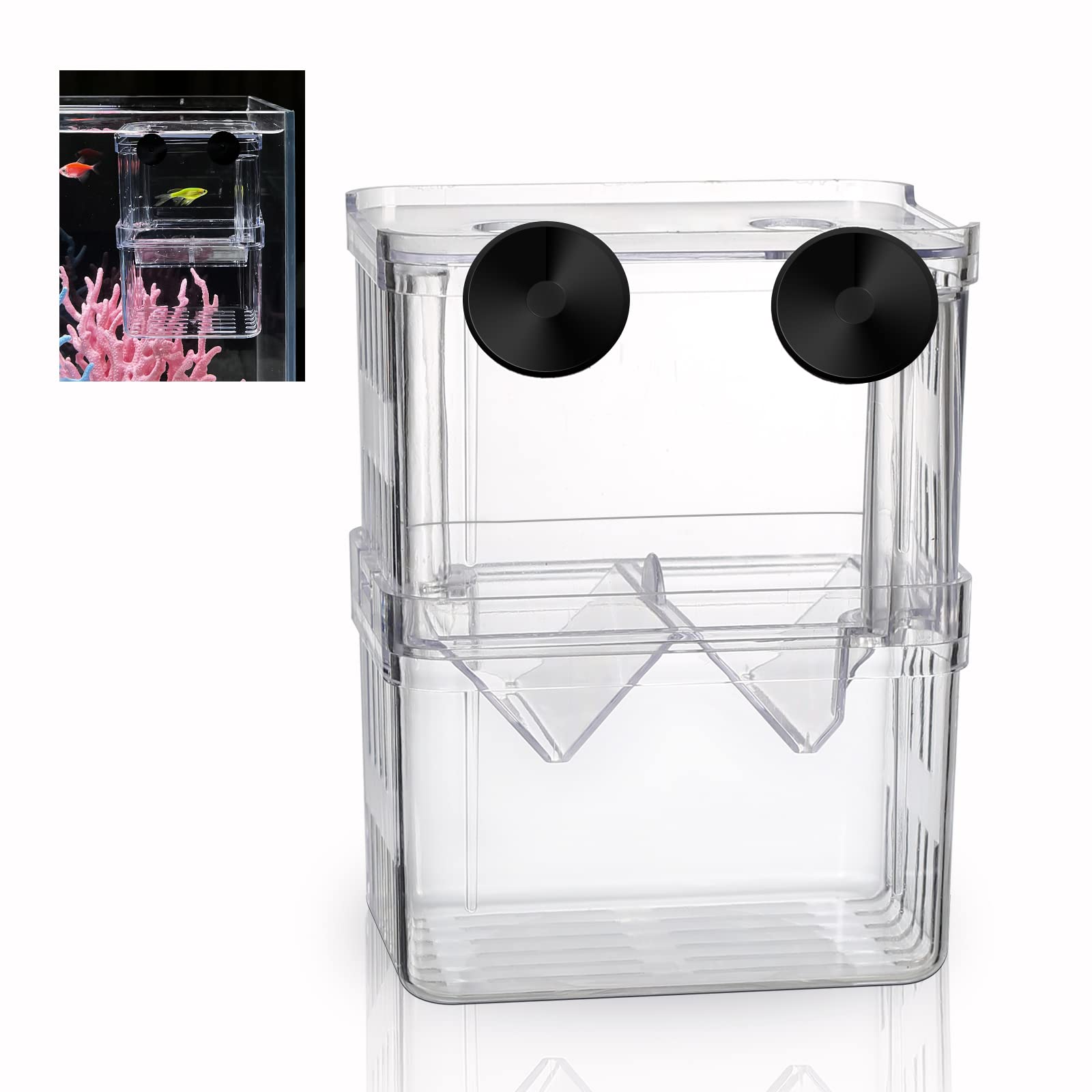 Feature: 100% brand new and high quality. 1.Equipped with transparent plastic cover,to guarantee the fish will not be able to jump out. 2.Ideal isolation chamber for pregnant fish. 3.Safety chamber for weak or sick fish. 4.Unique floating design enable the hatchery to drift around and to be free for sinking. 5.Can be fixed in any place of the aquarium with sockers supplied. 6.Crystal like transparent box make it an extremely interesting event to watch the lying-in fish to deliver baby fish. 7.Strong duckers enable you to fix the hatchery easily in any corner of the tank. 8.Floating fish breeding box with removable grating. 9.Made of top quality and highly transparent plastic,enduring and long lasting Function: 1.The gap is small, and the mother tongue can be fed at the bottom after birth, which improves the survival rate. 2.High transparency, you can watch the mother fish or the betta fish, add a lot of fun. 3.Isolation and protection of offensive fish, injured fish, clownfish, etc. 4.Self-contained isolation plate to reduce danger, strong suction cup design, firm and space saving. 5.Suitable for freshwater and marine aquarium. 6.For breeding,fit the removable grating in the box so the newborn fish can more safe. 7.Allow the breeding box to sink slowly in the aquarium,and the breeding box will fill up with aquarium water and stay floating. Shape and size: Material: Acrylic Color: Transparent M:(L*W*H)210 *95*100mm/8.3*3.7*3.9 Weight :0.26kg/0.57lb Packing list: 1Pc x Fish Breeding Hatchery Young Fish Incubator Isolation Box