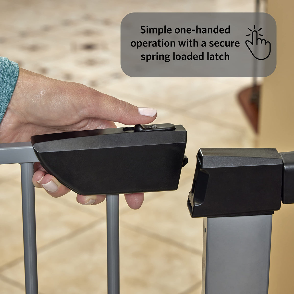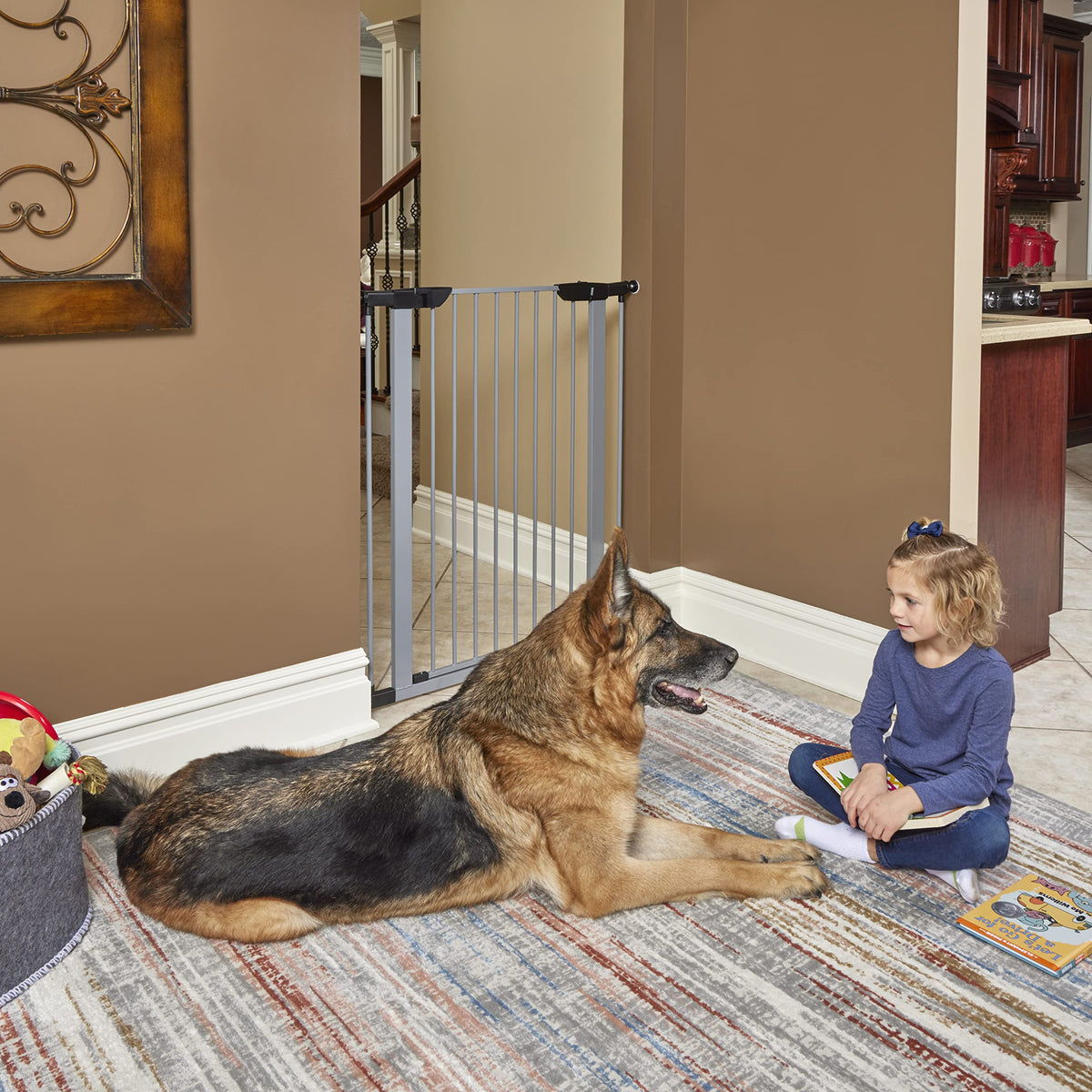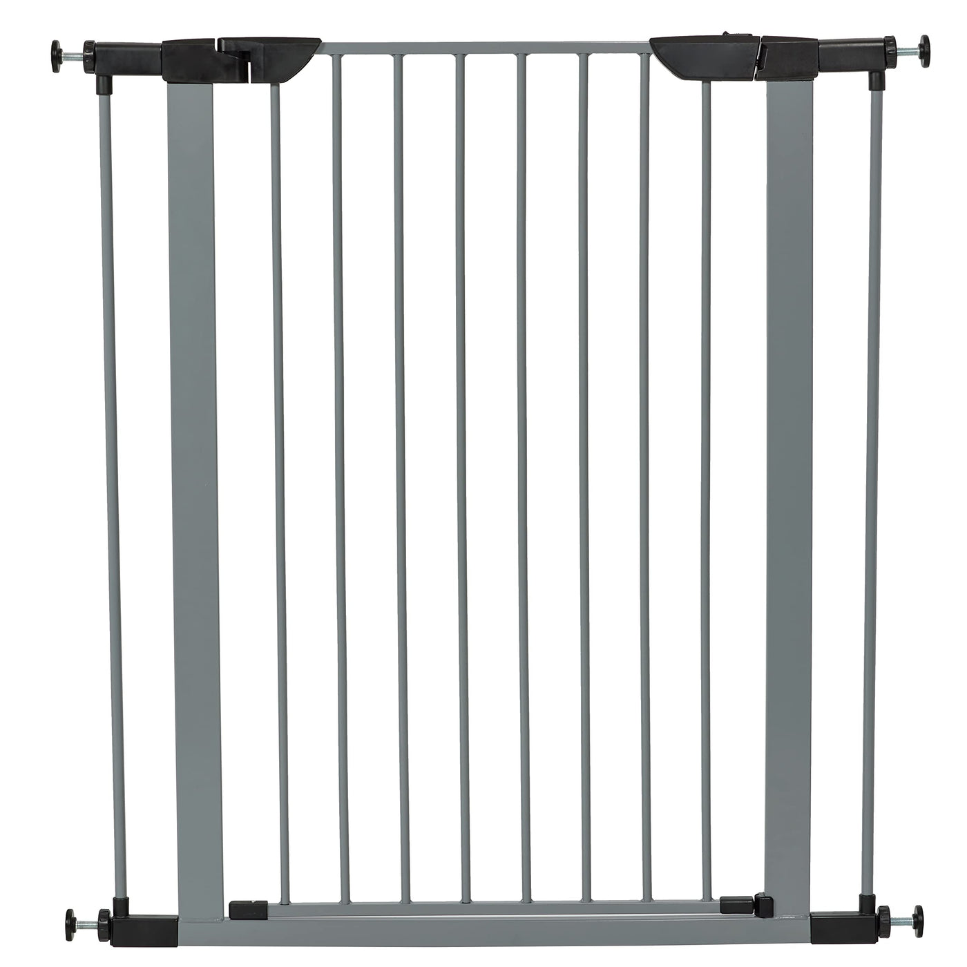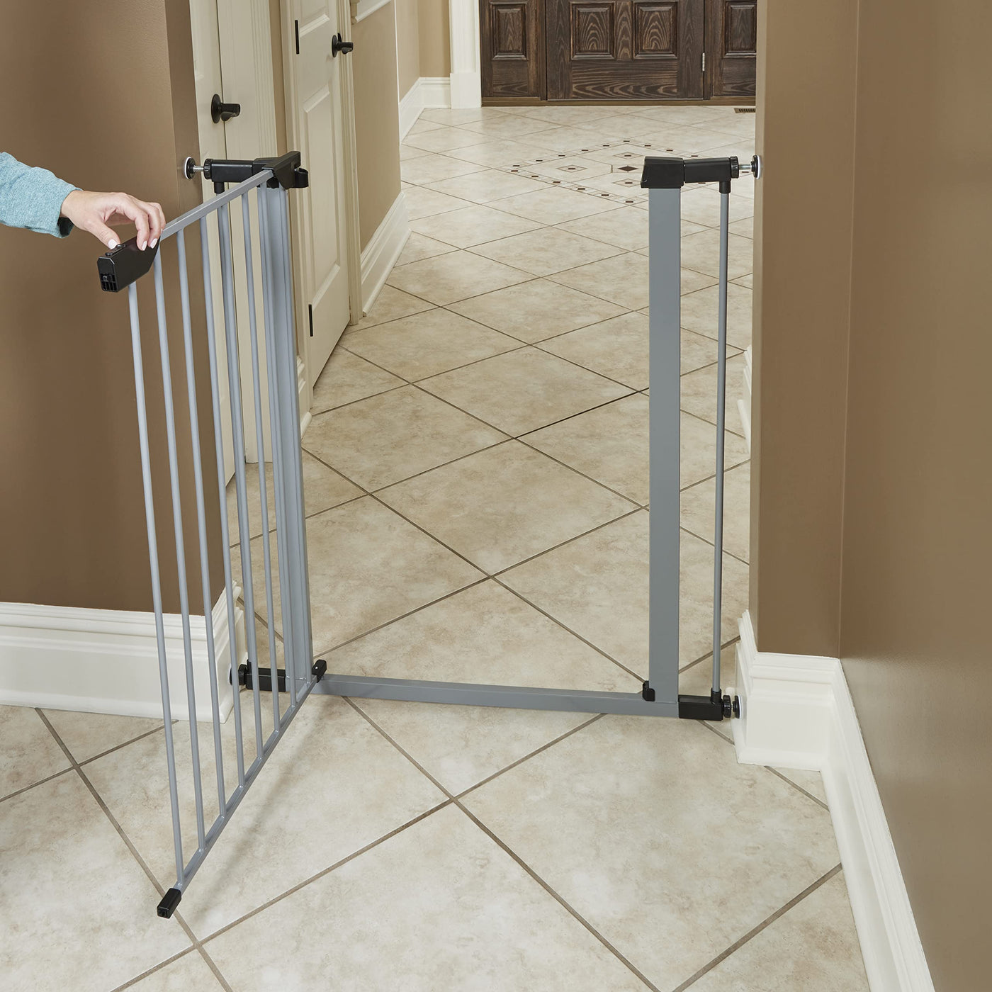 The Light Gray Steel Pet Gate By New World Is A Convenient Way To Partition Off Rooms From Your Dog And Other Pets To Keep Them Safe And Out Of Harms Way. The Strong, Durable And Chew-Proof Safety Gates Design Is Made Of Tubular Steel And The Attractive Light Gray Color Is Sure To Compliment Any Home D Cor. This Pet Gate (Model # B2939Sgy) Measures 39 Inches Tall And Expands From 29.5 - 38 Inches Wide To Fit Most Doorways And Stairwells. The Pet Gate Door Measures 19 Inches Wide With 2.25-Inch Spacing Between The Vertical Bars. The Convenient Walk-Through Doors One-Handed Opening Design Allows You To Easily Open The Dog Gate While Carrying Groceries And Etc. In Your Other Hand. The Spring-Loaded Latch And Lift & Open Operation Securely Keep The Dog Gate Closed And Your Pet Contained In The Desired Location Of Your Home. Each Pet Safety Gate Comes With 4 Wall Safe Easy-To-Set Pressure Mounts, Two Additional 3-Inch Extensions And A Tightening Tool To Securely Assemble The Pet Gate In Your Doorway (The Gap Between The Pet Gate And The Latch Will Be Eliminated When Pet Gate Is Fully Installed With The Pressure Mounts). If You Need Additional Extensions We Also Have A 3-Inch, 6-Inch Or 11-Inch Extensions Available. Please Note We Only Suggest Using 1 Set Of Gate Extensions For Each Gate (Whether They Be 3, 6, Or 11 Inch) To Ensure A Firm / Sturdy Assembly. Have The Peace Of Mind That Your Dog Or Other Pet Is Securely Contained Where You Left Them With A Pet Gate From New World.