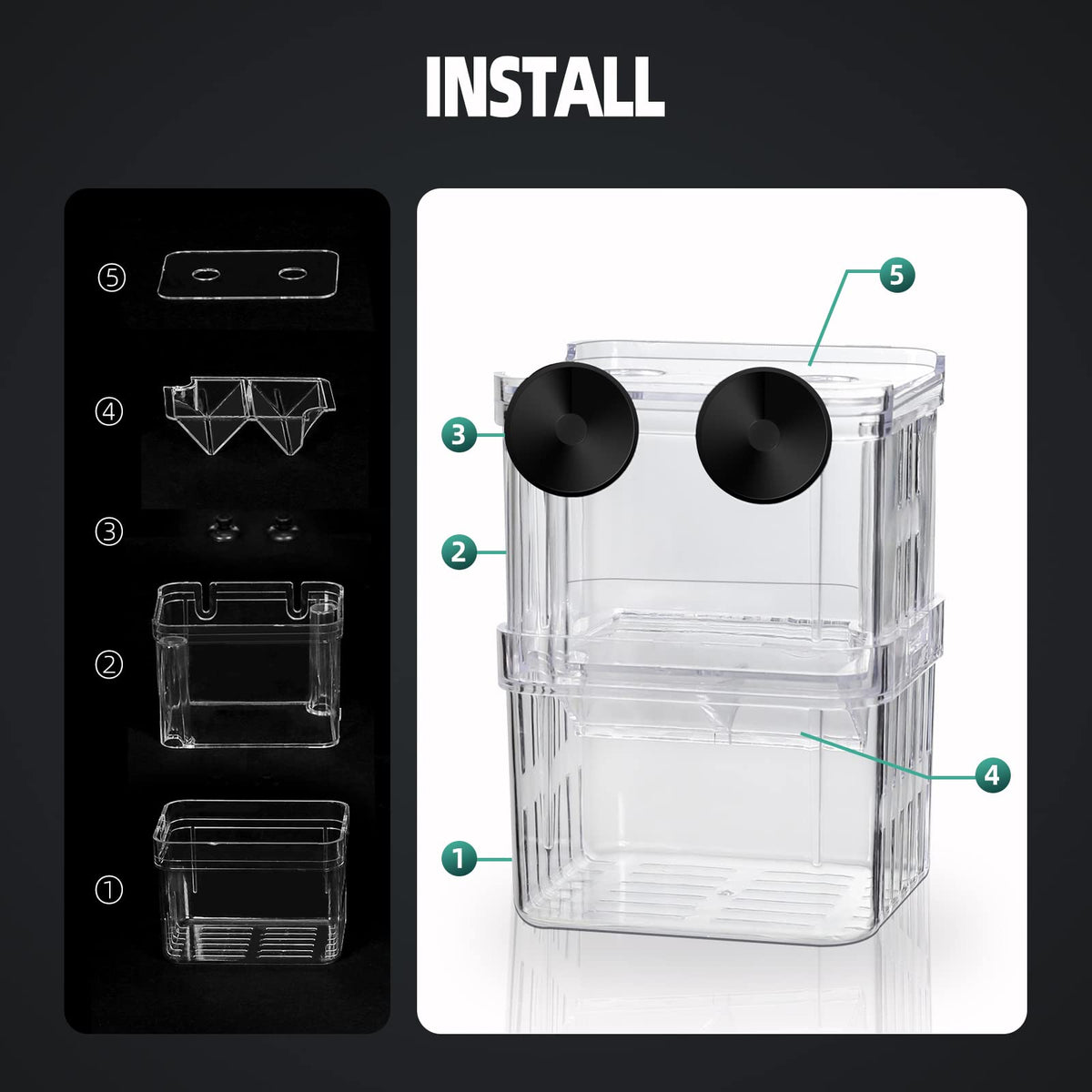 Feature: 100% brand new and high quality. 1.Ideal isolation chamber for pregnant fish. 2.The lying-in fish to deliver baby fish. 3.Floating fish breeding box with removable grating. 4.Made of top quality and highly transparent plastic,enduring and long lasting 5.Crystal like transparent box make it an extremely interesting event to watch the lying-in fish to deliver baby fish 6.Can be fixed in any place of the aquarium with sockers supplied 7.This breeding box ensure that fish eggs or new born fish are safety separated from other aquarium inhabitants. Function: 1.The gap is small, and the mother tongue can be fed at the bottom after birth, which improves the survival rate. 2.High transparency, you can watch the mother fish or the betta fish, add a lot of fun. 3.Isolation and protection of offensive fish, injured fish, clownfish, etc. 4.Self-contained isolation plate to reduce danger, strong suction cup design, firm and space saving. 5.Suitable for freshwater and marine aquarium. 6.For breeding,fit the removable grating in the box so the newborn fish can more safe. 7.Allow the breeding box to sink slowly in the aquarium,and the breeding box will fill up with aquarium water and stay floating. Notes: 1.without grating:It can fit for raising small fry and for isolating a sick or aggressive fish 2.with grating and divider it can as a breeding box for 2 fish,removable center divider allows two fish to be safely isolated. 3.with grating can as a breeding box. Shape and size: Material: Acrylic Color: Transparent S:(L*W*H):132*68*73mm/5.2*2.7*2.9 Weight :0.11kg/0.24lb Packing list: 1Pc x Fish Breeding Hatchery Young Fish Incubator Isolation Box