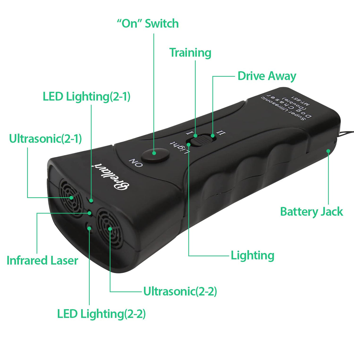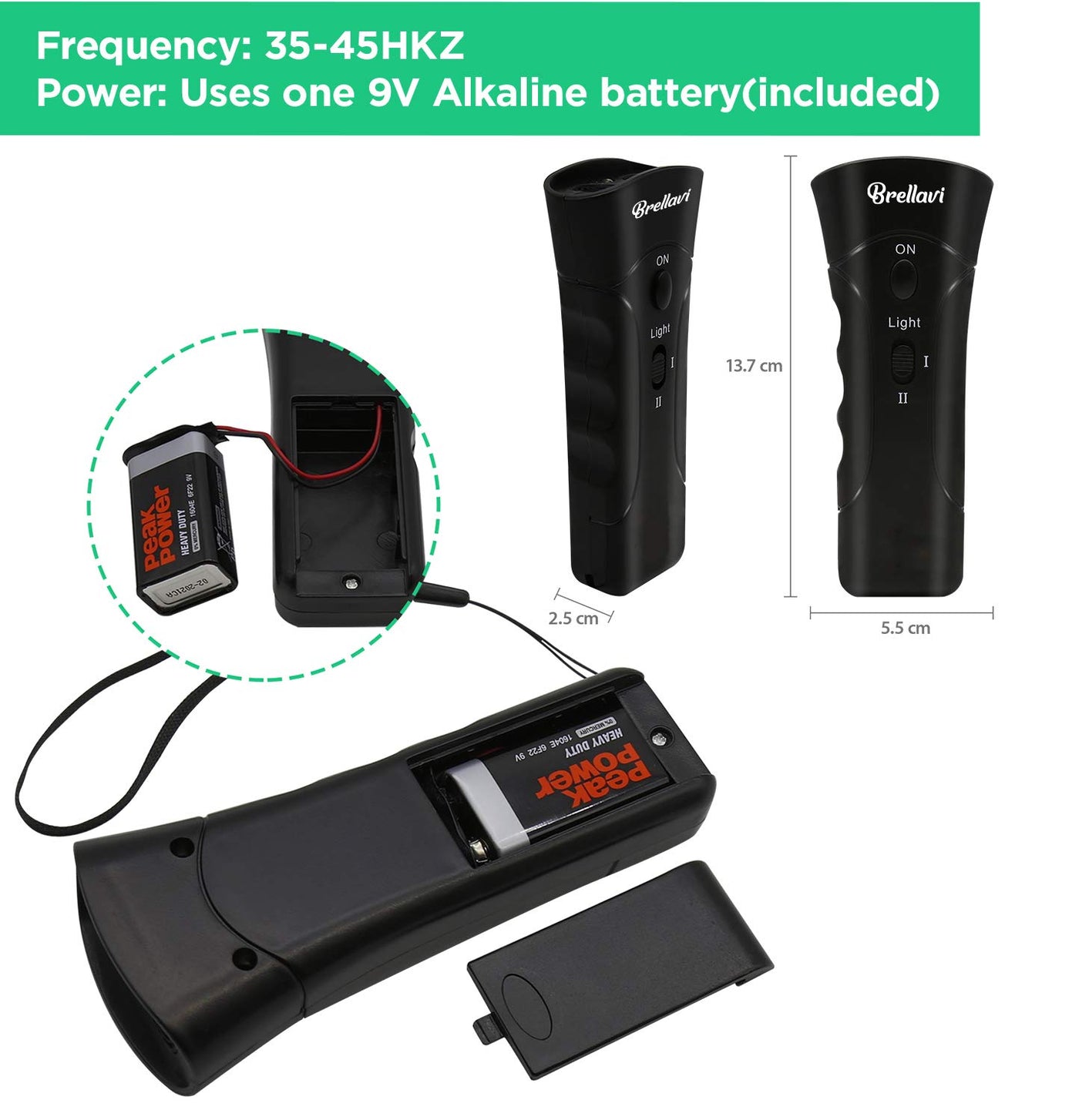 Upgraded Dog Trainer and Barking control: The Upgraded Dog Trainer and the anti-barking device will help you to train dog and bark control Train your dog in good behavior stop clawing digging scratching biting and staying off the furniture Keep Unfriendly Dogs Away: Sometimes kids or adults will be hurt by unfriendly dogs The handheld Barking control device uses two transmitters which can do Barking control dogs away It can reach up to 50 feet (15 M) It will protect you from the unfriendly dogs to send a message to the approaching dogs before they become aggressive while you are walking running bicycling etc Safe for Human and Pet: Upgraded Handheld Dog Trainer and Barking control Device uses physical methods to stimulate dogs The human hearing range is from 20HZ to 20KHZ the dog hearing range is from 15HZ to 120KHZ The Bark control emits sound around 35 to 45HKZ so it is safe for humans and pets convenient of Brellavi Dog Trainer and Barking control: The dog Barking control and training device is about 137 x 55 x 25 cm It is handheld Easy to carry wherever you go Such as walking jogging picnic cycling and so on Safety Night with Dog Trainer and Barking control: The anti-dog barking device has a super bright LED flashlight that can protect against the vicious dog while you are outdoor at night It also can be an ordinary flashlight at night