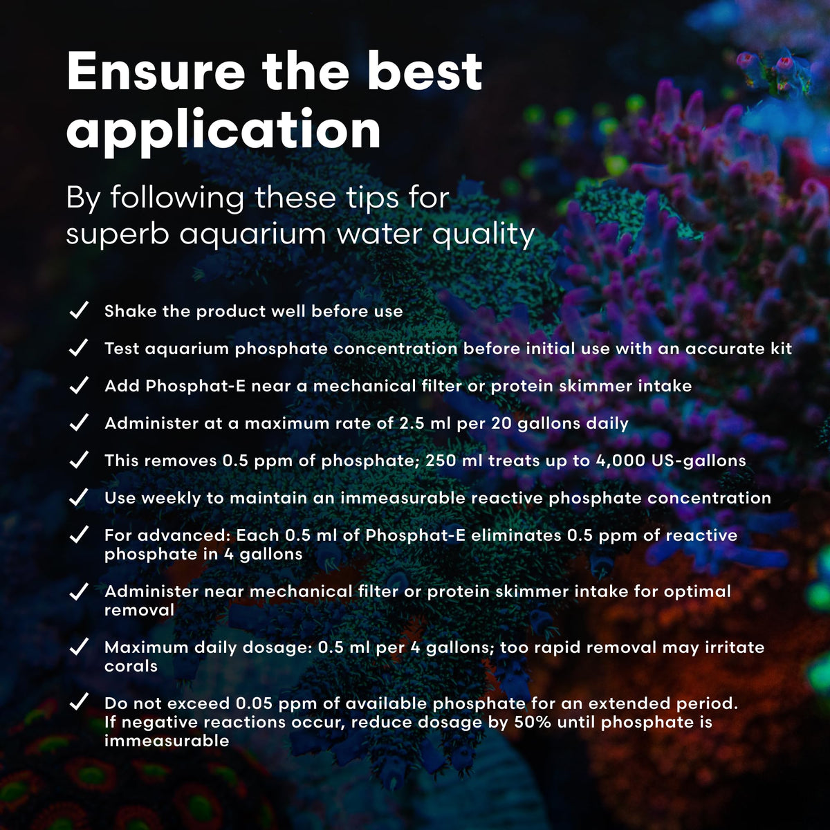 Brightwell Aquatics Phosphat-E Liquid Phosphate Remover for Marine Fish and Reef Aquarium Experience a new level of aquatic care with Brightwell Aquatics Phosphat-E Liquid Phosphate Remover for Marine Fish and Reef Aquarium - the ultimate solution for achieving a balanced and thriving aquatic environment. The expertly formulated marine phosphate water conditioner offers immediate action, by eliminating 1 ppm of reactive phosphate in 4 gallons of water upon application, and is safe for all reef and marine fish environments as well as freshwater. With over 50% more strength than competitors, this potent formula provides a long-lasting solution, treating 1,000 gallons per 250ml of product. The clear instructions cater to both beginners and advanced users, ensuring ease of use, while emphasizing the importance of aquarium health, educating users on proper husbandry practices and the significance of phosphate control. Whether youre setting up a new tank or maintaining an established one, the Phosphat-E Liquid Phosphate Remover is your go to solution. Its versatility extends to both marine and reef aquariums, providing powerful support for a diverse range of aquatic environments. FEATURES AT A GLANCE Immediate Phosphate Elimination Potent Solution Sensitivity Considerations Enhanced Strength Long-Lasting Treatment Safe for All Inhabitants Formulated by a Marine Scientist AMERICAN-MADE EXCELLENCE Trust in the quality and excellence of Brightwell Aquatics, an industry-leading brand committed to providing innovative and scientifically backed aquatic care products. Made in the USA, we consistently strive to deliver advanced superior quality solutions to elevate the vibrancy and health of your aquarium.