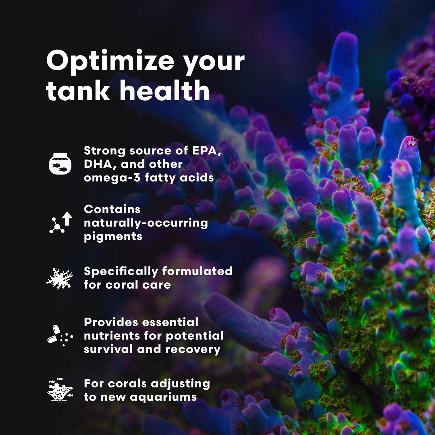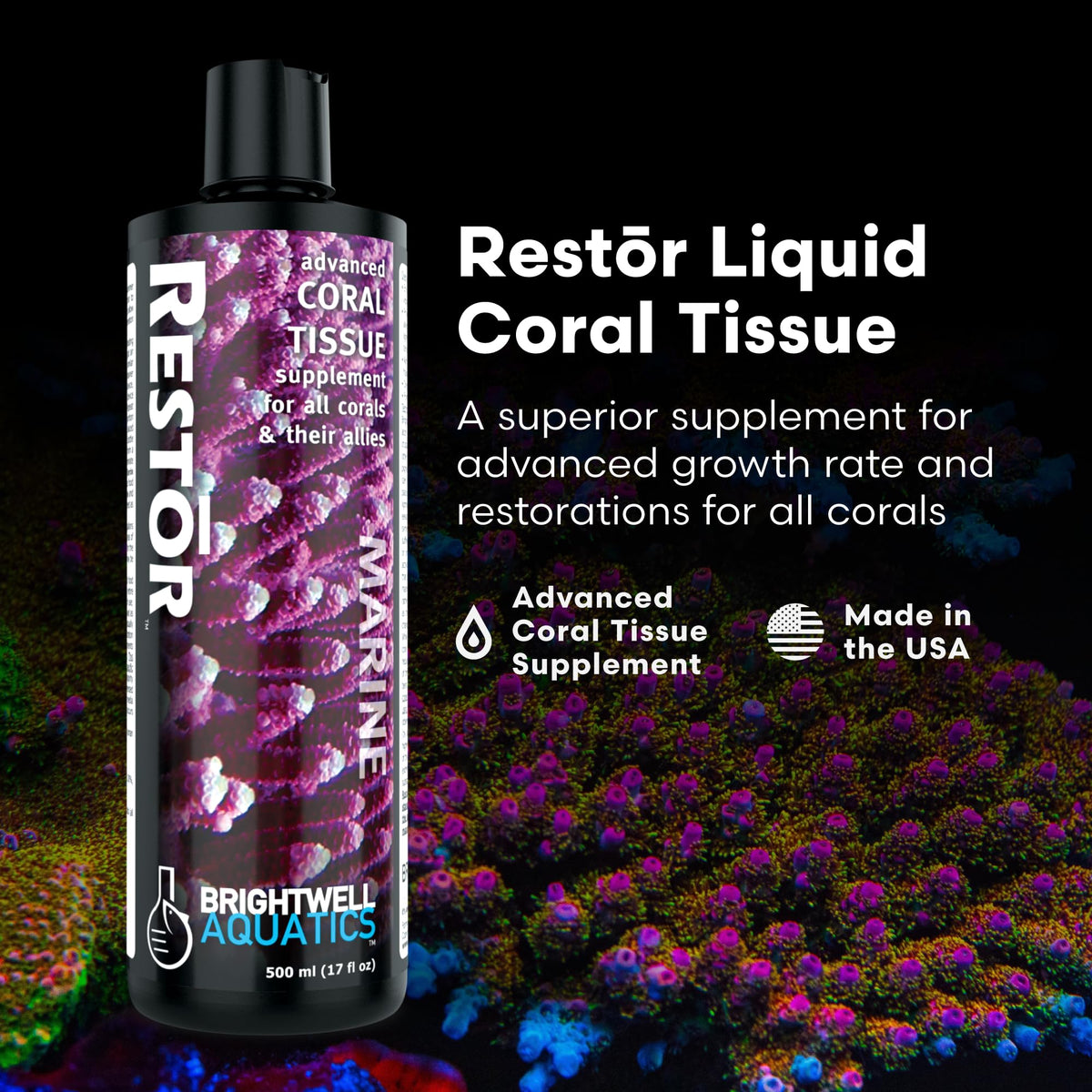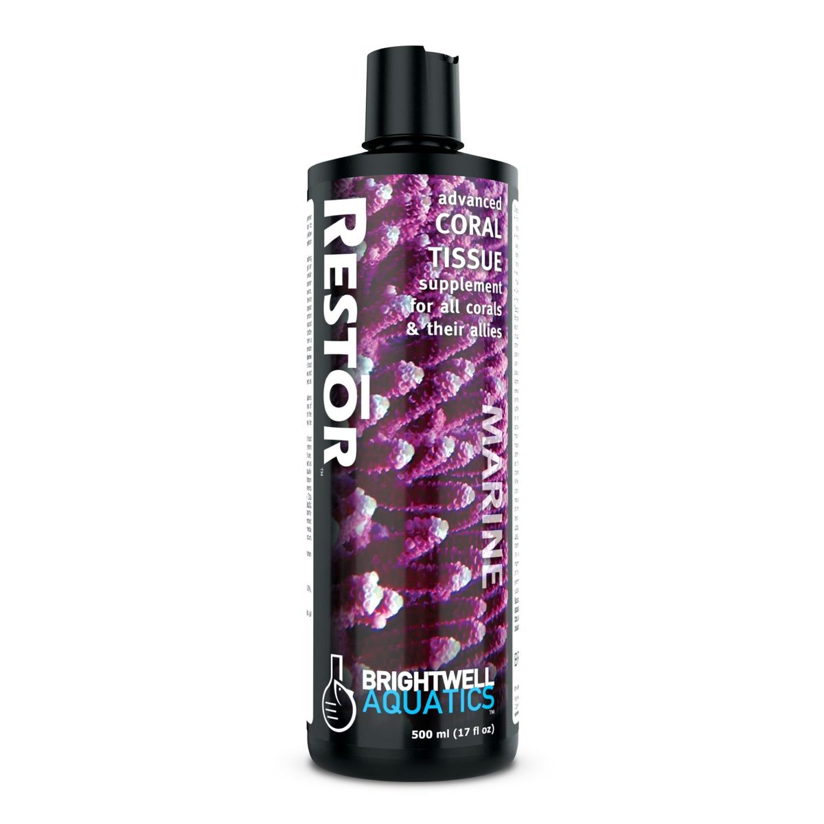 Brightwell Aquatics Restor Liquid Coral Tissue Supplement - Reef Supplements Experience a new level of aquarium care with Brightwell Aquatics Restor Liquid Coral Tissue - the ultimate solution for achieving a balanced and thriving aquatic environment. Crafted using a complex of proteins, and amino and fatty acids derived from marine sources, Restor Liquid Coral Tissue Supplement is a strong source of EPA, DHA, and other omega-3 fatty acids, as well as naturally-occurring pigments. Restor was specifically formulated to restore and revive corals and their allies that have been recently placed into a new aquarium and are adjusting to new lighting; have recently been exposed to prolonged elevated temperatures (inducing expulsion of symbiotic zooxanthellae or bleaching); have suffered tissue damage either through fragmenting or propagation or through the unwanted grazing activities of other aquarium inhabitants or aquarium pests. It also accelerates tissue growth rates and assists coloration in all corals Whether youre setting up a new tank or maintaining an established one, Restor Liquid Coral Tissue is your go-to solution. Its versatility extends to both freshwater and marine aquariums, providing powerful support for a diverse range of aquatic environments. FEATURES AT A GLANCE Encourages health and healing, growth, reproduction, and vibrant coloration. Used by professional coral farmers to increase tissue growth rate Provides important nutrients to corals and their allies during periods of stress Aids in tissue repair after corals have undergone fragmenting and captive propagation Does not require refrigeration Formulated by a marine scientist AMERICAN-MADE EXCELLENCE Trust in the quality and excellence of Brightwell Aquatics, an industry-leading brand committed to providing innovative and scientifically backed aquatic care products. Made in the USA, we consistently strive to deliver advanced superior quality solutions to elevate the vibrancy and health of your aquarium.