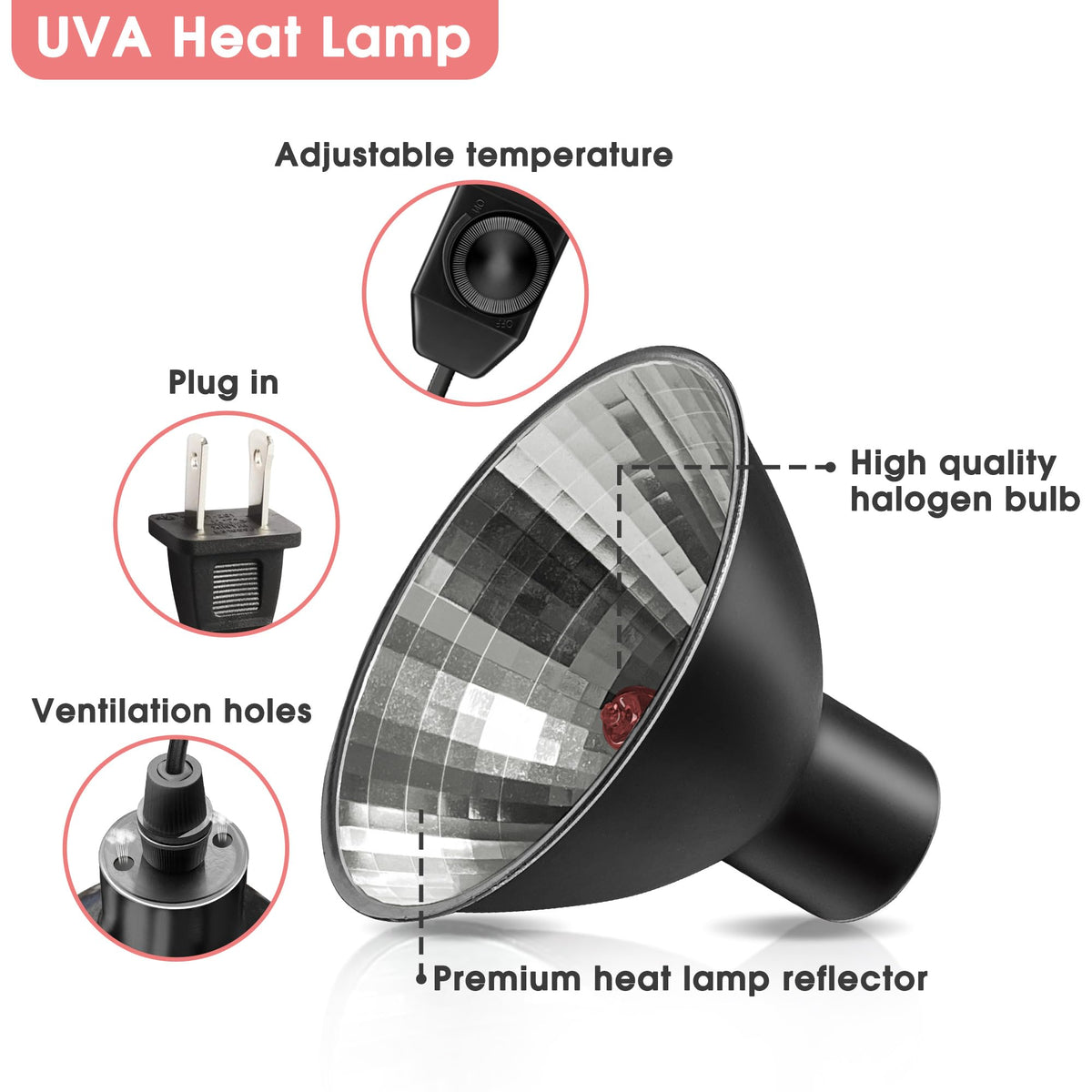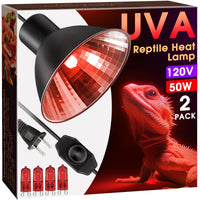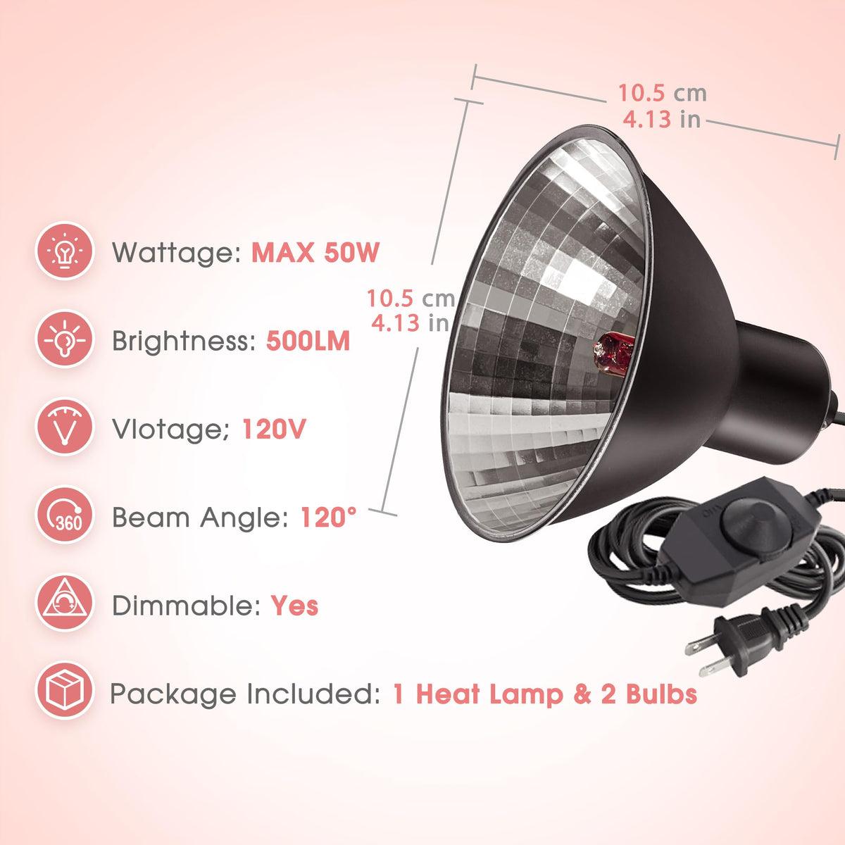 Product InformationWattage: Max 50WVlotage:120VDimmable: YesBrightness: 500LMCRI: 98+ Package Included: 4-pack G9 heat bulb & 2-pack aluminium heat lamp. Tip: please be cautious to the hot surface after using. Essential Warmth for Reptiles: With 50 watt high output, this reptile light provides sufficient heat for reptiles, which is essential for promoting their appetite, improving their digestion and courtship activities. Great Aluminum Reflector: Made of great aluminium alloy material, our reptile heat lamp can significantly increase the output of UVA lighting. Perfect for bearded dragon, gecko, snake, lizard, chameleon, frog, toad, turtle, etc. Dimmable Heat Lamp: Adjust the temperature in the tank without changing the distance. With the stepless dimming function, this Reptile Heat Lamp is easy to adjust a right temperature for your reptile pets. Excellent Heat Dissipation: The radiating and ventilation hole on the top can make sure the good heat dissipation effect. High Quality and Satisfied Service: Our Briignite Heat Lamp concerns about your reptile pet's health and better growth. Please contact us for any questions and we are committed to fixing your issues timely.