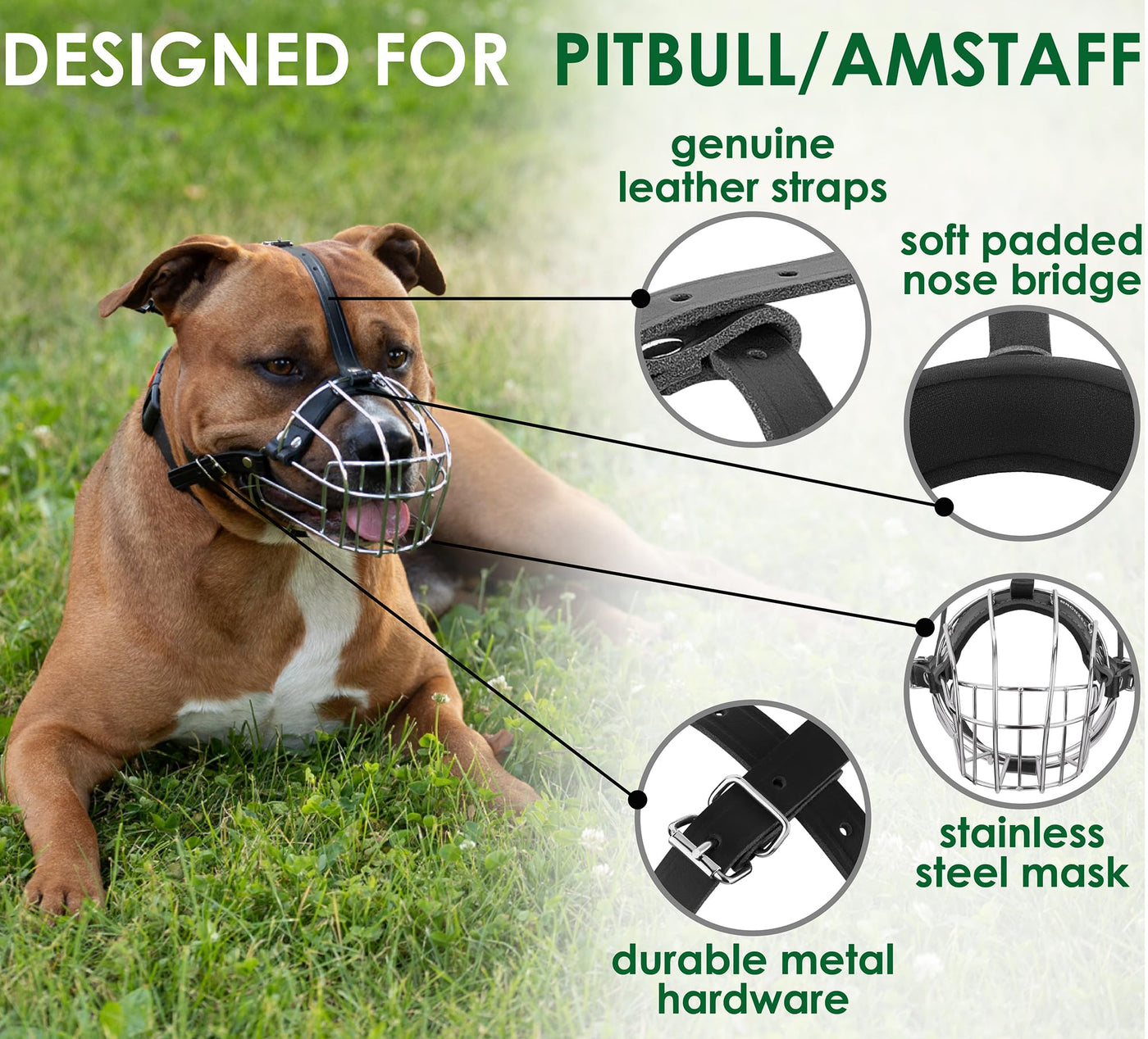 Pitbull dog muzzle size: Girth of dog's snout is 12 inches, length of dog's snout is 3 1/2 inches. Please measure your dog snout before purchasing the item. This is basket muzzle is made of durable stainless steel and has a soft padding and has a four adjusting straps for comfort fitting dog muzzle. This is dog muzzle allows plenty of air in, which is necessary for your pets comfort and wellbeing. Comfortable shape basket dog muzzle allows unrestricted nose licking. Steel dog muzzle is perfect for walking, training, vet, grooming and etc. Muzzle is the type of ammunition that is only meant to be used for short periods of time, and only when your dog is supervised. muzzles are used to prevent dog bites. They are not for preventing problem behaviors by forcing your dogs mouth closed. Do not use a dog muzzle for barking, chewing, or other ongoing behavioral problems. If you believe that muzzle is a must have for your pet, please ask for professional advice from dog trainer.