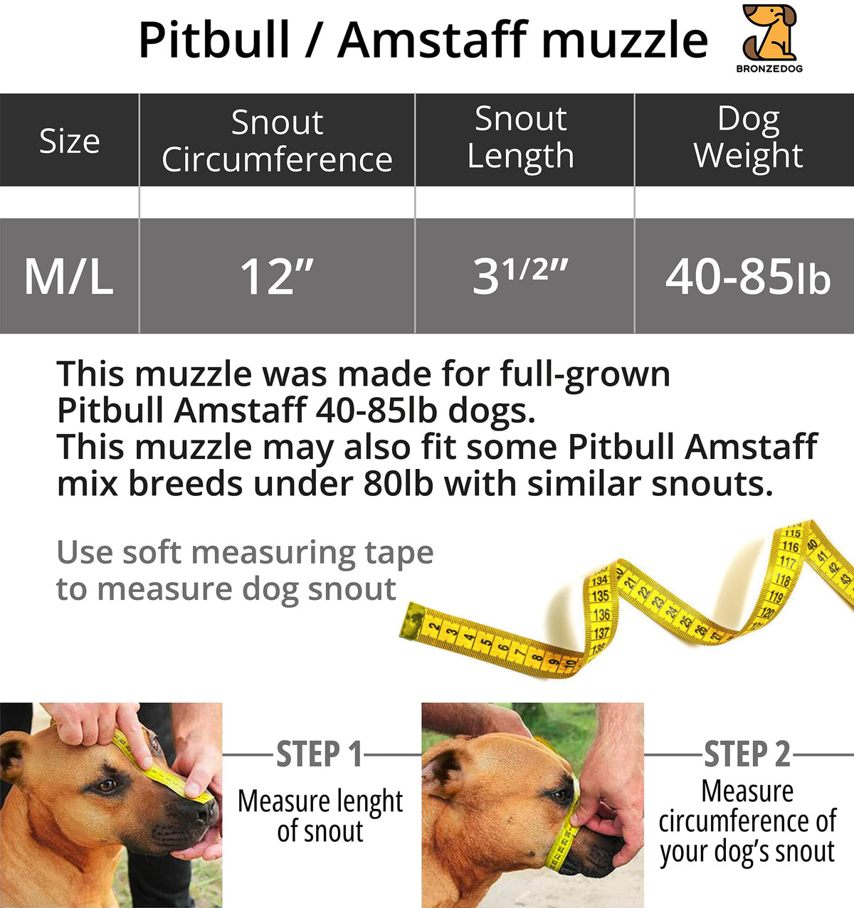 Pitbull dog muzzle size: Girth of dog's snout is 12 inches, length of dog's snout is 3 1/2 inches. Please measure your dog snout before purchasing the item. This is basket muzzle is made of durable stainless steel and has a soft padding and has a four adjusting straps for comfort fitting dog muzzle. This is dog muzzle allows plenty of air in, which is necessary for your pets comfort and wellbeing. Comfortable shape basket dog muzzle allows unrestricted nose licking. Steel dog muzzle is perfect for walking, training, vet, grooming and etc. Muzzle is the type of ammunition that is only meant to be used for short periods of time, and only when your dog is supervised. muzzles are used to prevent dog bites. They are not for preventing problem behaviors by forcing your dog’s mouth closed. Do not use a dog muzzle for barking, chewing, or other ongoing behavioral problems. If you believe that muzzle is a must have for your pet, please ask for professional advice from dog trainer.