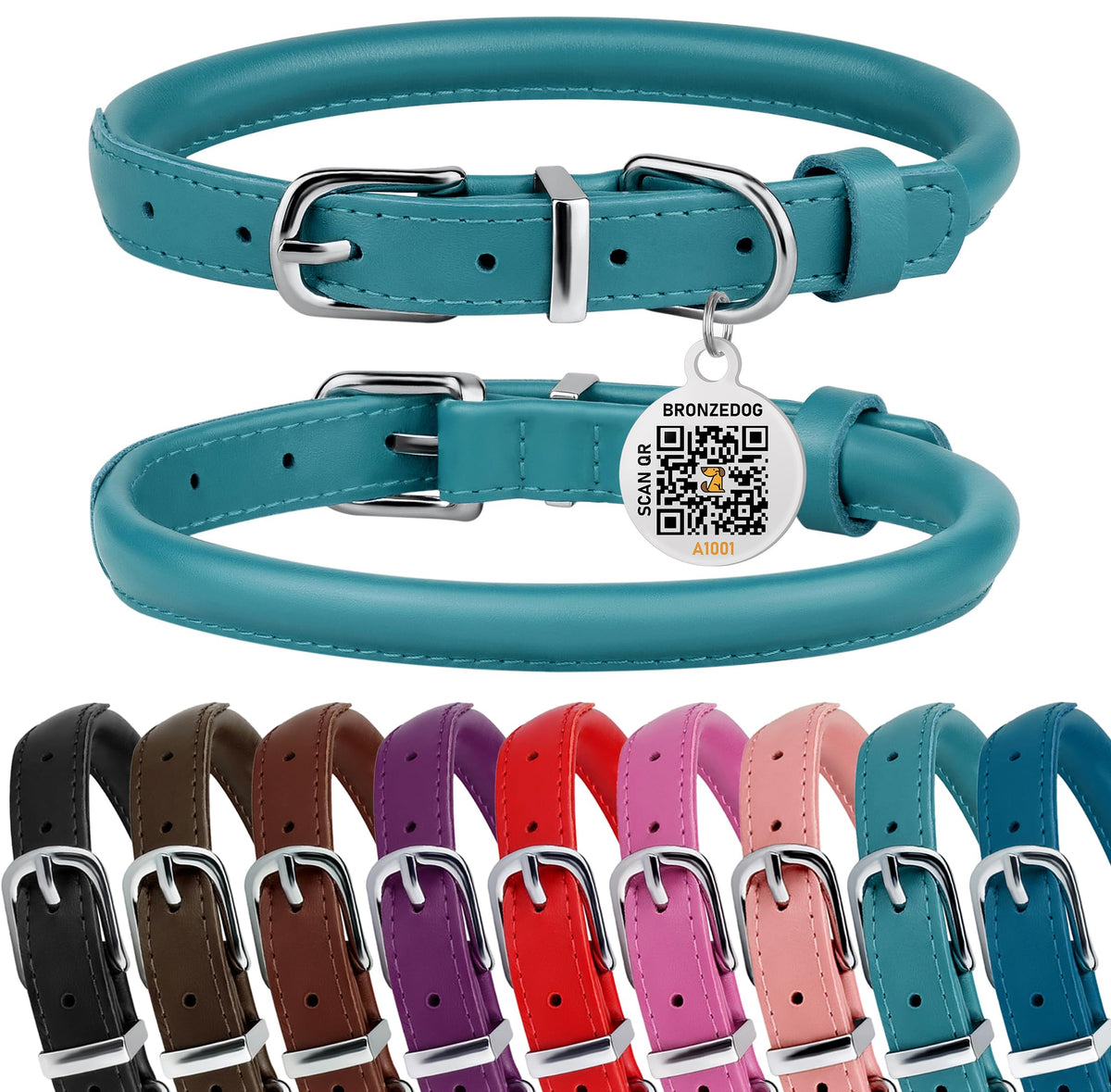 Bronzedog Rolled Leather Dog Collar For Small Medium Large Dogs With Qr Id Tag (S: 12-14 Inch, Teal)