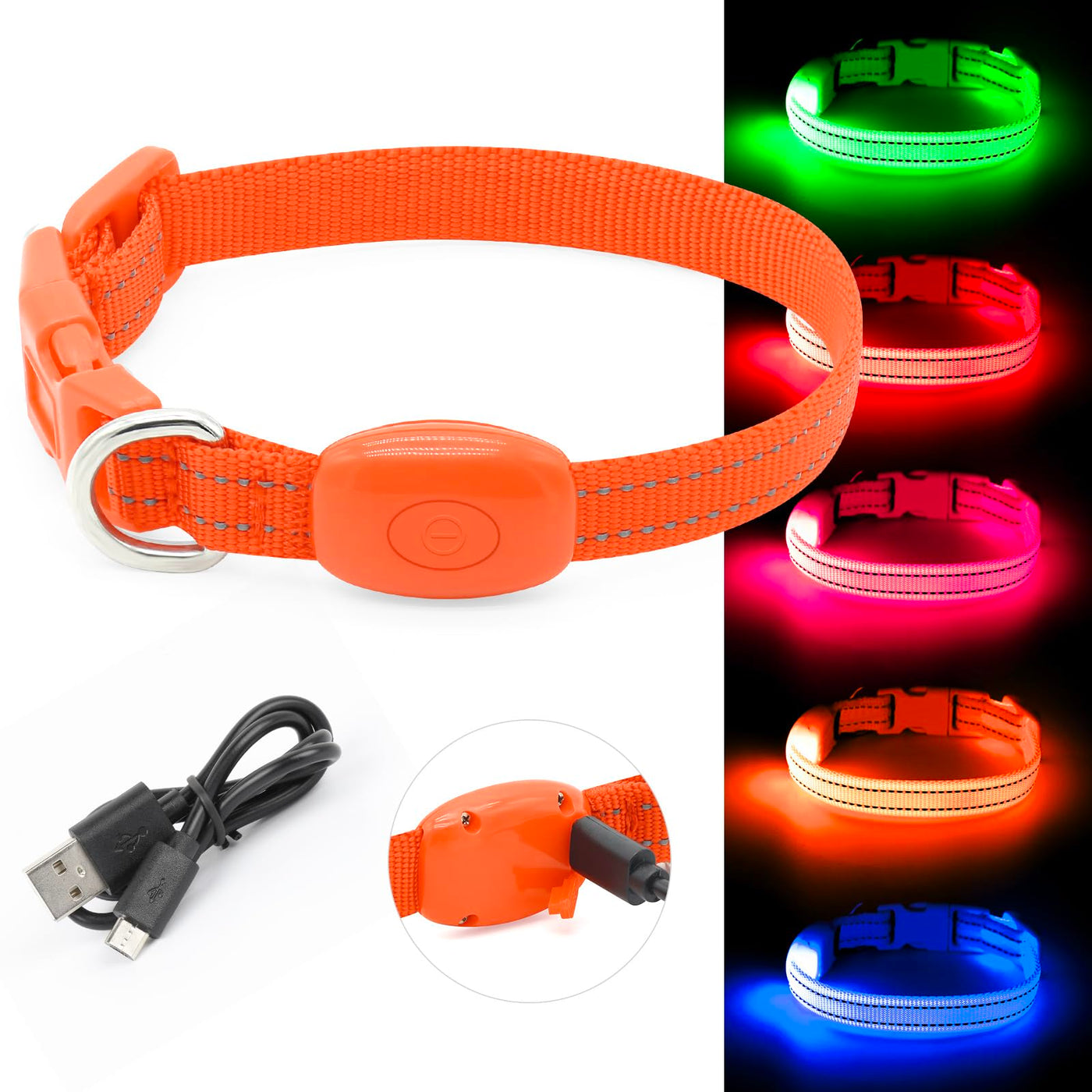 Q: What colors are available for this light up collar?A: The BSEEN Light Up Dog Collar is available in several vibrant colors: Red, Orange, Pink, Green, and Blue.