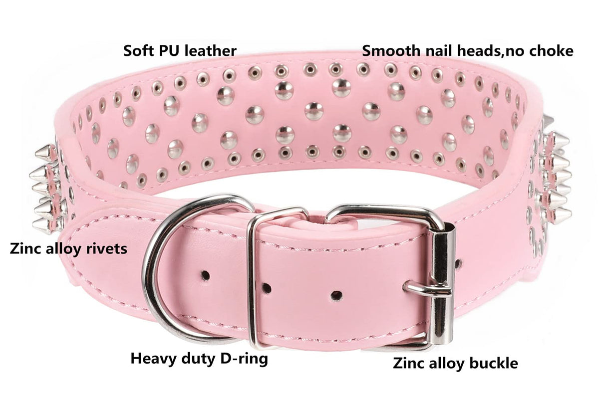 Btdcfy Hoot Pu Leather Adjustable Spiked Studded Dog Collar 2 Wide 37 Spikes (M(Neck 19-22), Pink)