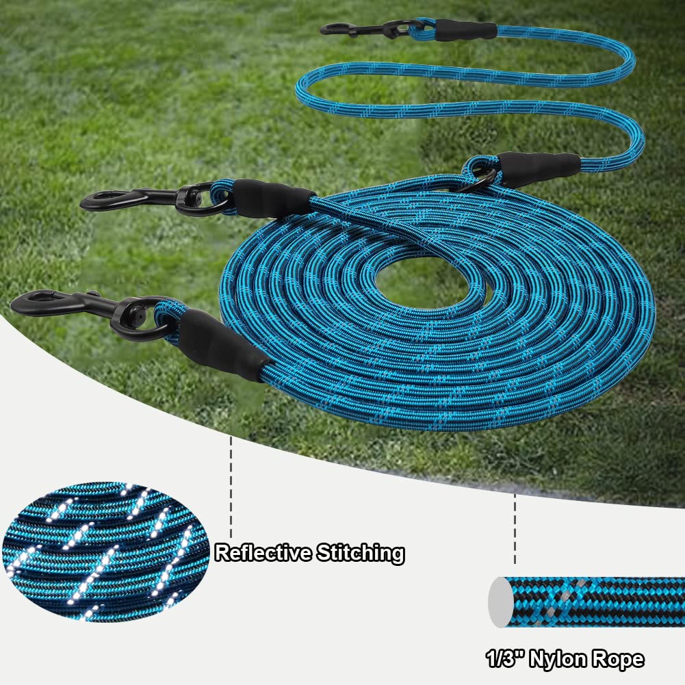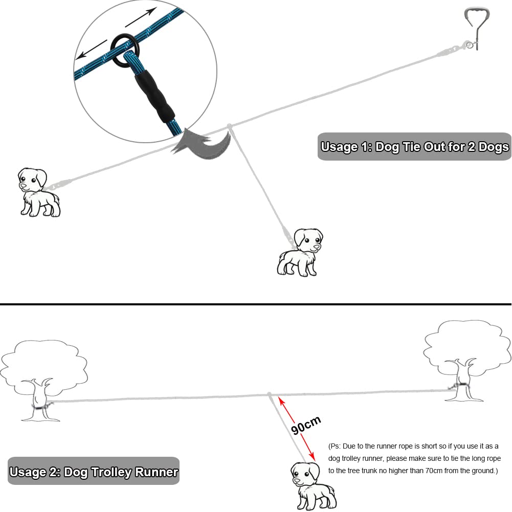 Btinesful 12Ft 20Ft 30Ft Reflective Dog Tie Out For 2 Dogs, No Tangle 1/3 Inch Nylon Rope Tether For Two Dogs, Dog Trolley Runner For Yard Outdoor Camping If You Have 2 Dogs, And Always Tie-Out Them In Front Yard Or Backyard For Playing.This Is A Best Dog Tie Out Rope For 2 Dogs. No Need 2 Seperate Leashes. No Worry About The Tangle. 1 Tie Out To Tether Your Two Dogs. Easy And Convenient! 12Ft 20Ft 30Ft Three Different Lengths For The Main Long Rope Tether. You Can Use Them To Keep Your Dogs Safe In Camping, Park, Yard, Garden And Other Outdoor Activities. Give Both Of Them Enough Freedom And No Worry About Run Away. Its Lightweight, Also Easy To Carry. Safety & Freedom:This Long Dog Run Tether Can Tie 2 Dogs And Ensures Their Safety Within A Designated Area And No Worries About Getting Hurt As Common Metal Cable Leads. It'S Also A Dual Dog Leash For Small To Large Dogs, Providing Them With The Freedom To Roam And Enjoy Outdoor Activities. Great For Running Or Walking At The Park, Camping, Backyard, Garden And Outside Playing. Lightweight & Easy-Set Up: 1 Leash For 2 Dogs. This Long Dog Leash For Two Dogs Weights Less Than 1Lbs And Easy To Carry. The Simple Design Help You To Set Up Or Teardown It Within 3 Mins Without Any Hassle. Tie The Ropes Around Trees Or Ground Stakes, Or Simply Hold To Your Hands. Buckle The Clasp To The Long Rope To Make A Simple Handle. Save Your Time, Space And Money.