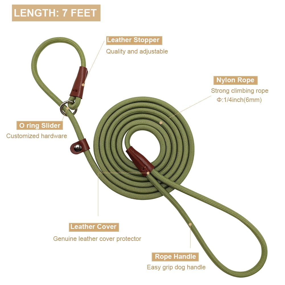 Btinesful 7Ft Slip Lead Dog Leash, Strong Nylon Rope Leash, 1/4 Inch Diam Dog Training Lead For Small Medium Large Dogs, Grass G