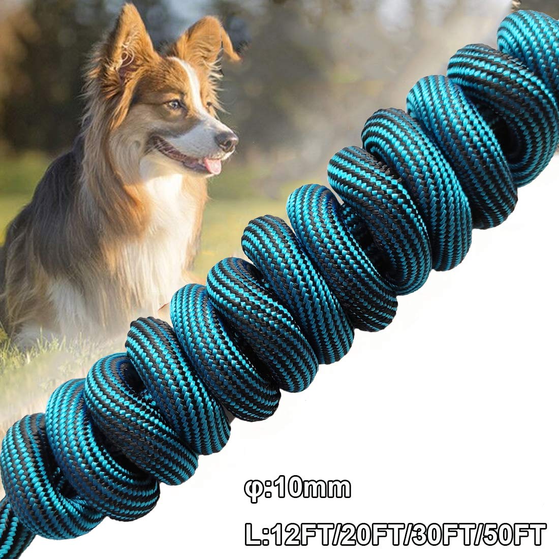 Size: 2/5' (10mm) diameter rope line. 8 foot, 12 foot, 20 foot, 30foot and 50 FT five length long lead
