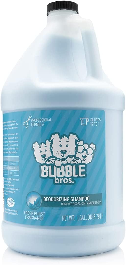 Bubble Bros. Deodorizing Shampoo removes odors, breaks through dirt and buildup and leaves pets smelling fresh. The deep cleaning formula is soap free and pH balanced for pets. DIRECTIONS: Dilute 12 parts water to 1 part shampoo. Wet down pet thoroughly. Apply diluted shampoo and start massaging into the skin and coat. Avoid contact with eyes. Allow shampoo to remain on the pet for a few minutes for best results. Rinse thoroughly, towel dry and blow dry. Safe for frequent, external use on pets 8 weeks of age and older. INGREDIENTS: Anionic Surfactant, Amphoteric Surfactant, Benzoin Tree Gum Preservative, Chelating Agent, Color, Reverse Osmosis Water, Fresh Burst Fragrance