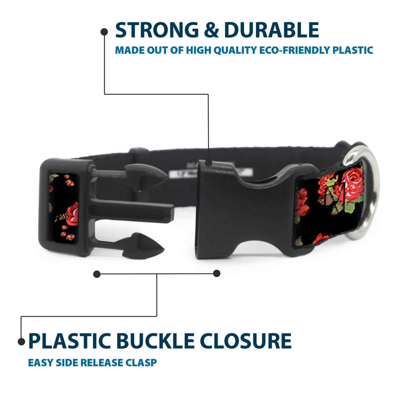 Buckle-Down 13-18 Red Roses Scattered Black Plastic Clip Collar, Wide Small