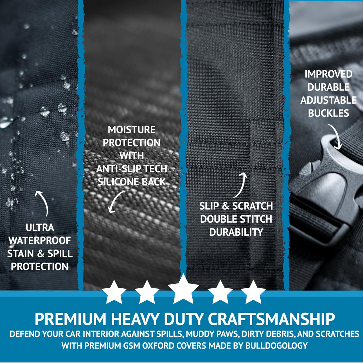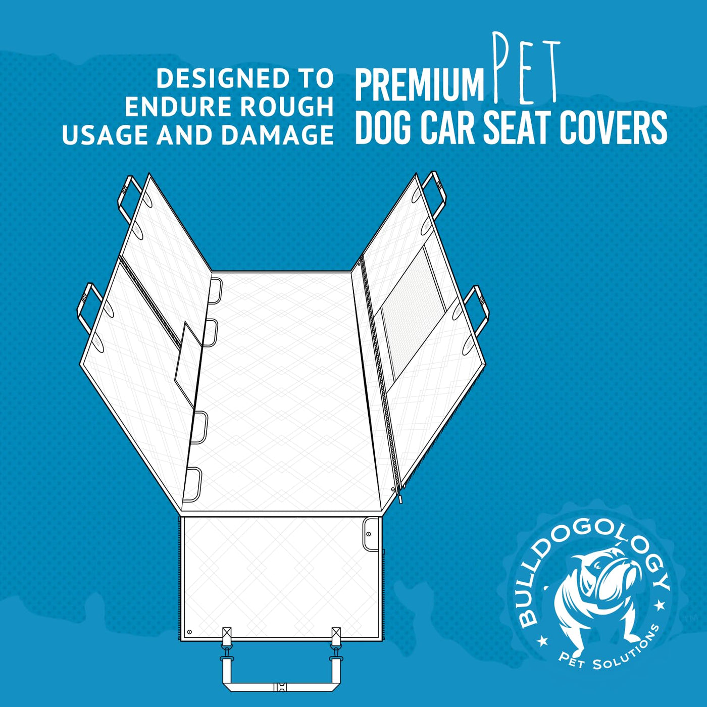 Q: What materials are used in the Bulldogology Dog Car Seat Cover?A: The seat cover is crafted from premium 600D GSM Oxford material, which is heavy-duty and waterproof. This ensures durability against dog hair, muddy paws, and spills while providing a comfortable ride for your pet.
