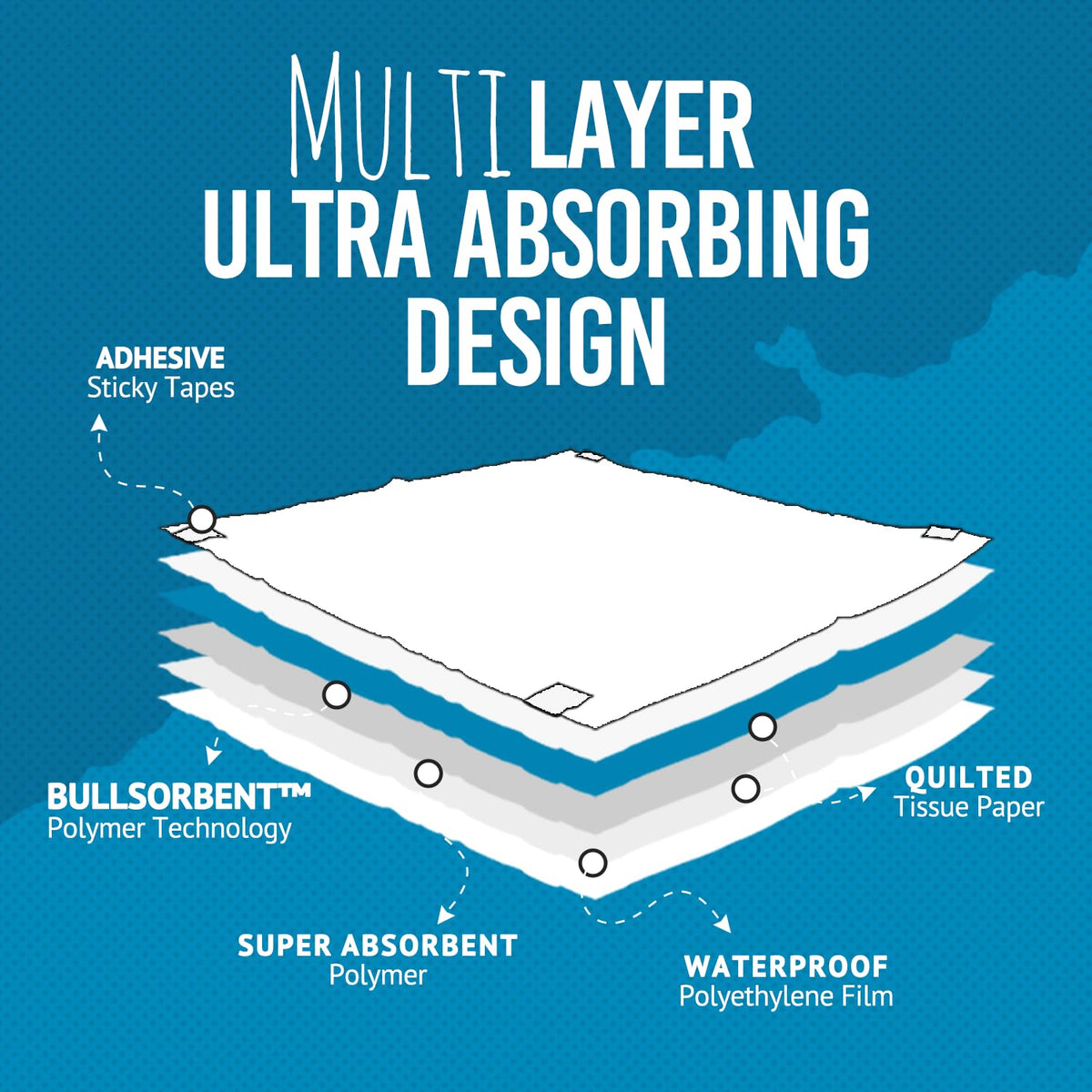 6 LAYER ABSORBENT: 100 count Large 24x24 Puppy Pee Pads with new Bullsorbent Polymer Tech that instantly absorbs fast and turns liquid into gel keeping floors tiles or carpets quickly dry ADHESIVE STIcKY TAPE: Best dog training housebreaking wee wee pads that prevent moving and leaving a huge mess on floors or tiles (sticky tape are optional adhesive can be very sticky) ODOR cONTROL: Pee pads for puppies adult dogs or any animal eliminate and neutralize odors fast guarantee to keep your home smelling fresh and clean BUILT-IN ATTRAcTANT: Perfect for busy dog owners attractant puppy pads to help housebreak your dog even if youre not home 110% MONEYBAcK gUARANTEED: If for any reason your not happy with our premium puppy training pads ask and well give you all your money back plus 10%