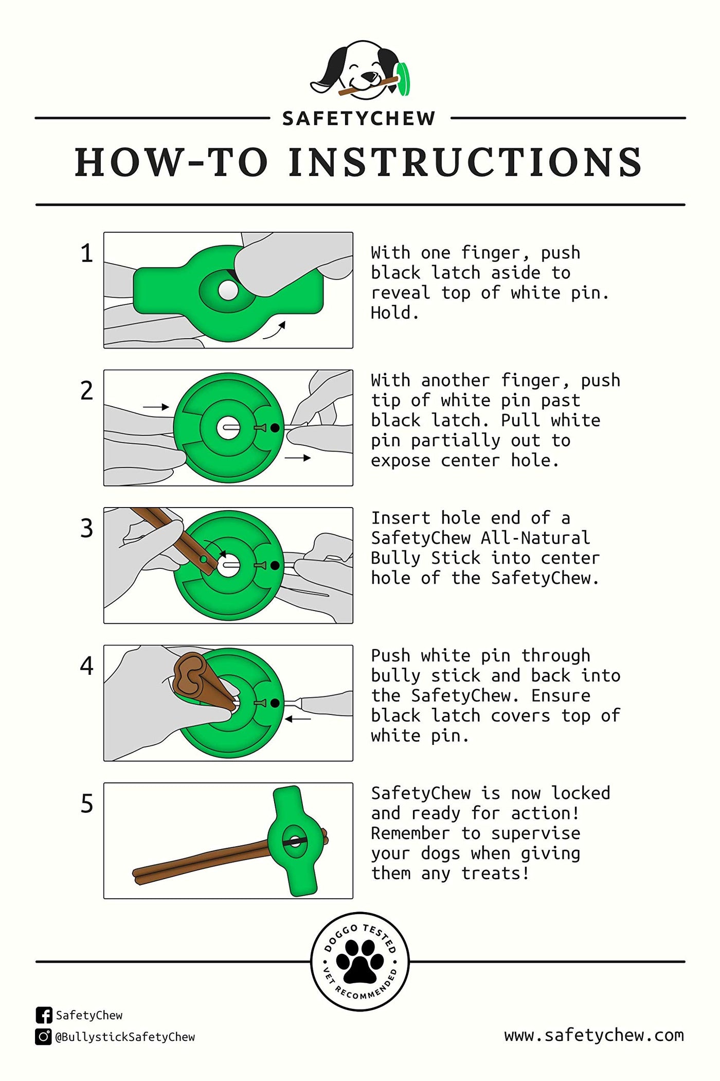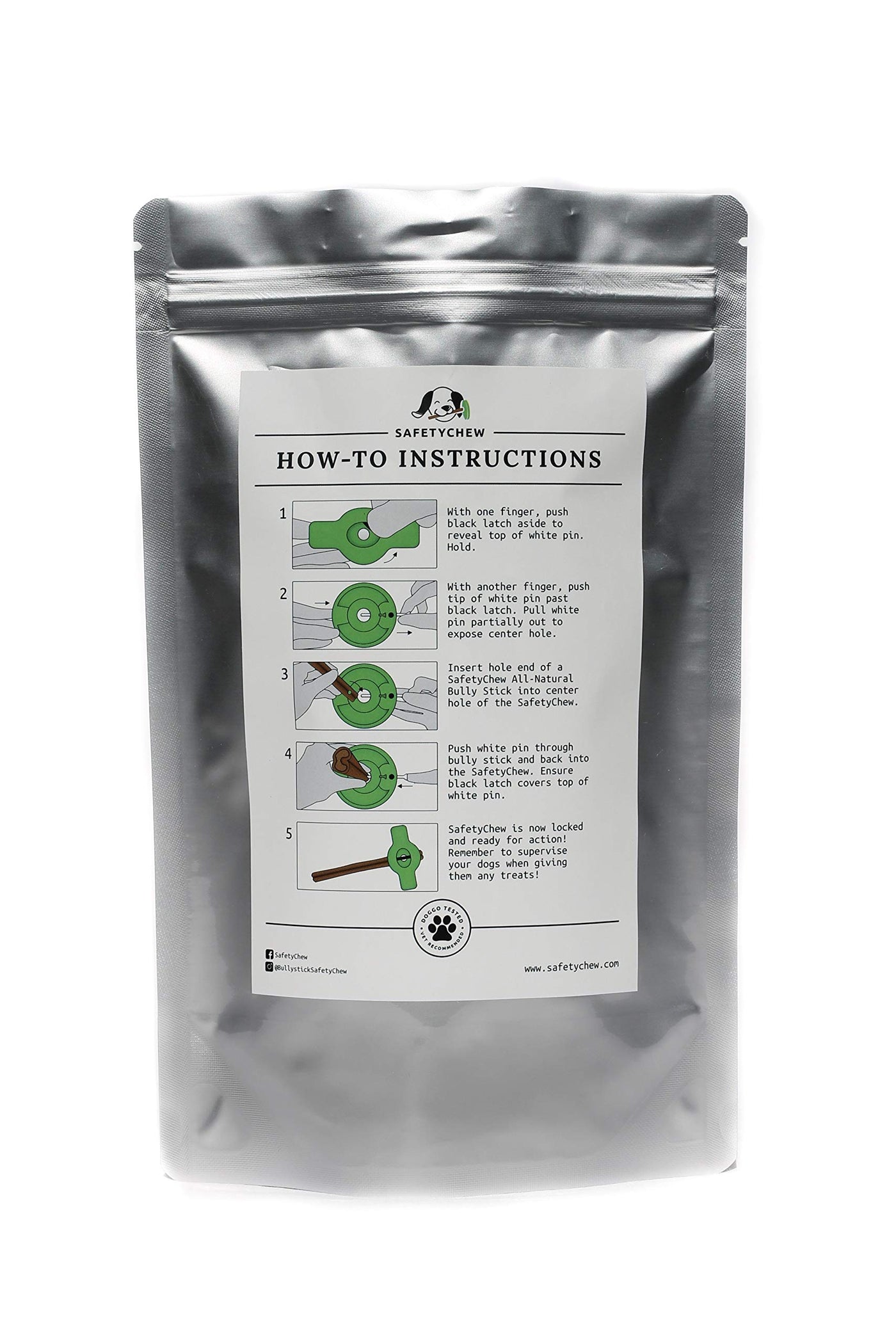Whats Inside?! One (1) patent pending SafetyChew - Made & Assembled in the USA! Three (3) All-Natural 6-inch Bully Sticks made specially for SafetyChew. Our SafetyChew All-Natural Bully Sticks are Free-Range, Grass-Fed, and free of harmful Chemicals and Hormones. Our bully sticks are consistently thick with an average weight of 25+ grams and come pre-drilled so theyre ready for use with SafetyChew. Sniff Test: Low to NO Odor. Nutritional Facts Crude Protein (Min): 85% Crude Fat (Min): 3% Moisture (Max): 11% Crude Fiber (Max): 1% Calories (Each) - 75 - 95. Please remember, no two bully sticks are the same! Please note, while SafetyChew is incredibly strong, we always recommend supervising your pup when giving them any sort of chew or treat. Please remember, SafetyChew is not a toy, and should be removed once the ring has done its job (when the bully stick has about an inch left). Allowing your pup to continue to go at it may risk damage to the ring.