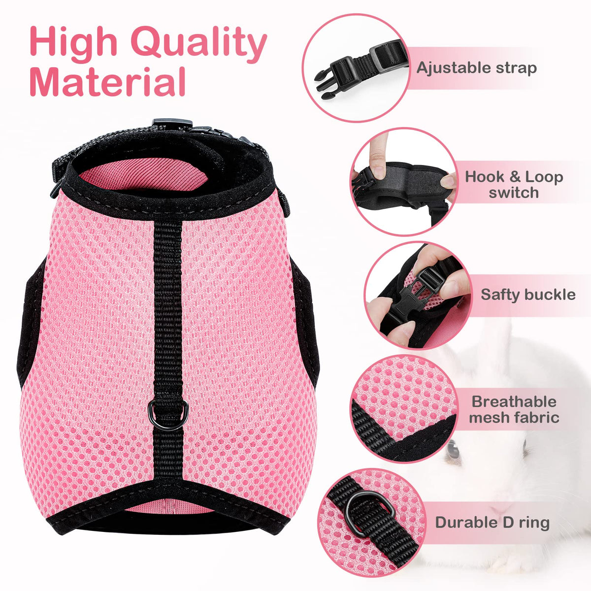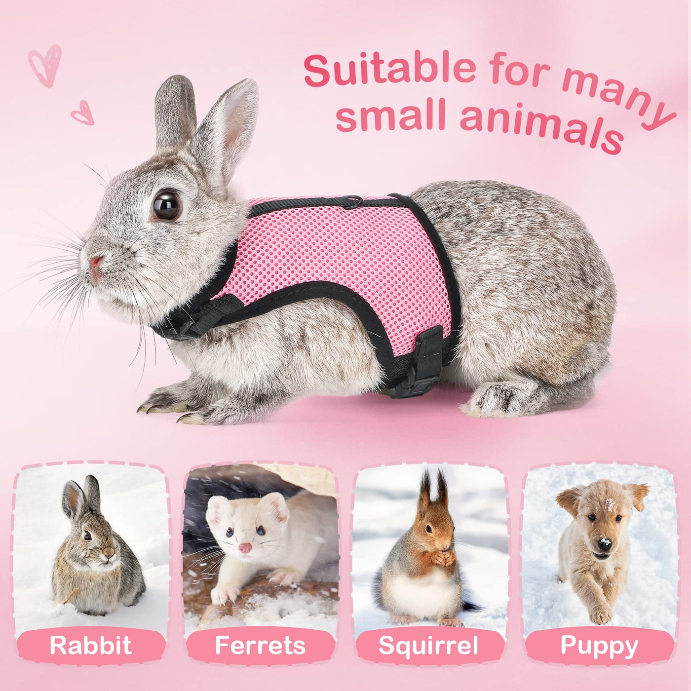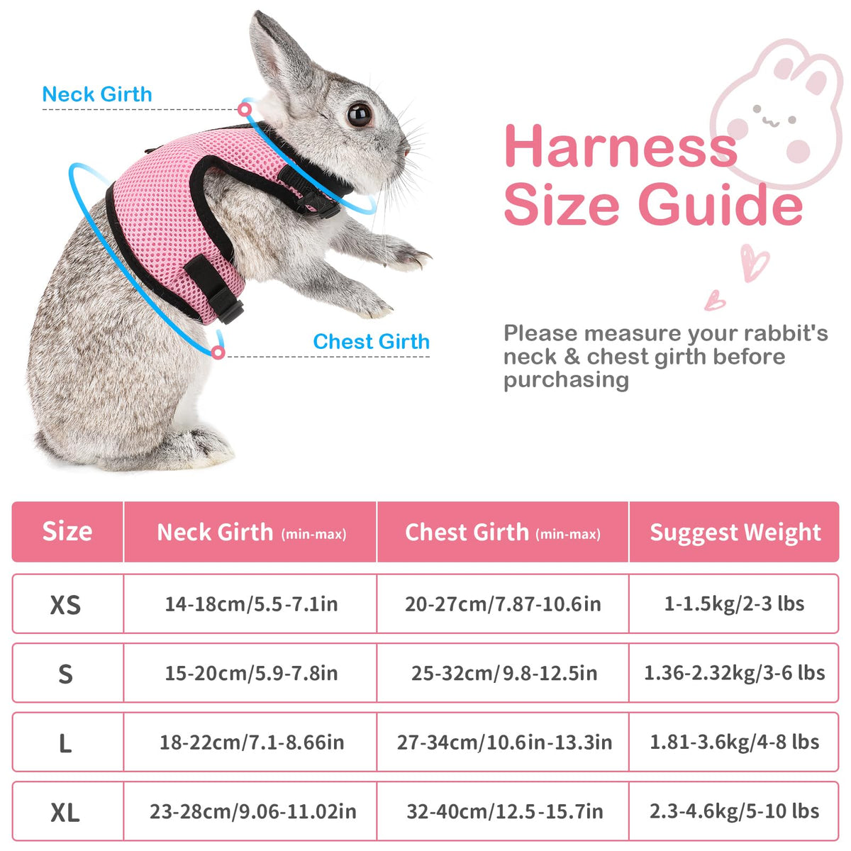 Product Description:Most Pet Rabbits Are Kept In Cages Or Hutches, Some Pet Owners May Allow Their Rabbits To Run Around Indoors, Do You Want A Soft Bunny Harness With Elastic Leash To Take Your Small Furry Friend Outdoor? The Pettom Rabbits Harness With Elastic Leash For Small Animal,Adjustable Soft Harness And Lead Set For Bunny Cat Little Pet Walking. It Can Solve The Issue For You!This Soft Harness Was Specifically Designed For Small Rabbits.It Is Made Of Hard-Wearing Polyester Fabric With Fully Elastic Leash Of 120 Cm/47-In To Extend To 250 Cm/98-In. The Harness Is Quick And Easy To Put On With Self-Adhesive Hook&Loop. This Harness Enables You To Take Your Rabbit Outside And Enjoy A Quiet Backyard, But Please Be Aware That Rabbits Don'T Go For Walks As Dogs Do. Product Featureshigh Quality For Sturdy And Long-Lasting Wearing. Comfortable To Wear Due To Soft Padding. Soft Harness With Fully Elastic Leash Of 120 Cm (47 In). Extra Nylon Strap With Snap Buckle, Adjustable At Chest And Stomach. Designed For Small Rabbits Between 3Lbs And 8Lbs.Specification:Material: Nylon & Mesh.Size Xs: Designed For Small Rabbits Between 2Lbs And 3Lbs, Stomach Circumference: 20-27 Cm (7.87-10.6 In) Size S: Designed For Small Rabbits Between 3Lbs And 6Lbs, Stomach Circumference: 25-32 Cm (9.8-12.5 In) Size L:Designed For Small Rabbits Between 4Lbs And 8Lbs, Stomach Circumference: 27-34 Cm (10.6-13.3 In)Size Xl:Designed For Rabbits Between 5Lbs And 10Lbs, Stomach Circumference: 32-40 Cm (12.5-15.7 In)Please Measure Your Rabbit To Ensure The Correct Size Is Purchased.Package:1 * Soft Harness With Lead For Rabbits Bunny Little Pets