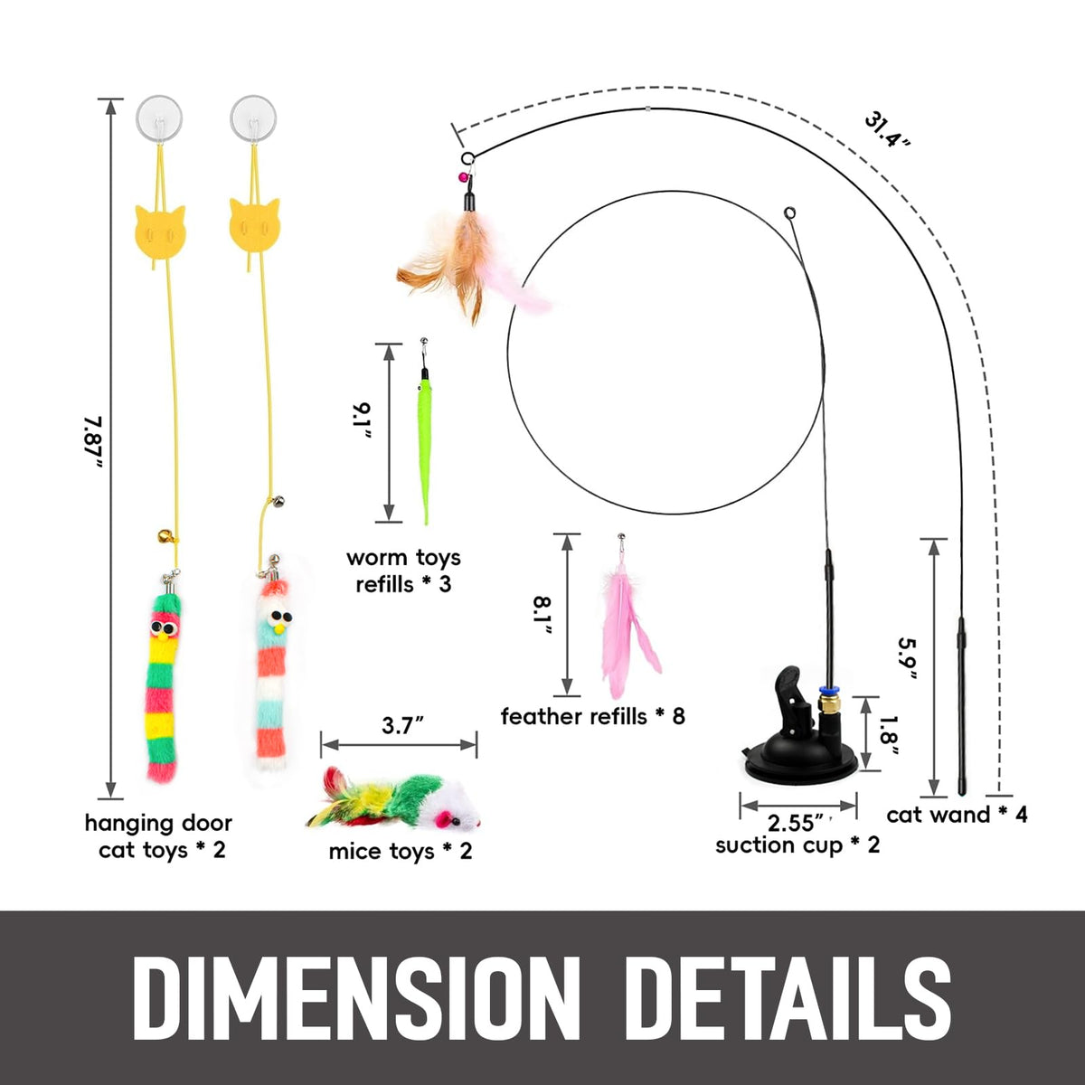 Our Suction Cup Cat Feather Stick And Hanging Cat Toys Can Keep Your Cats Happy When You Are Busy At Work/Out. Our Handheld Cat Feather Stick Can Create A Cozy Time For You When You Want To Interact More With Your Cat Our Feather Cat Toys Are Made Of Natural Feathers, Which Can Release The Hunting Nature Of Cats. It Includes 8 Cat Feather Refills And 3 Cat Bug Toy Refills With Bells, 2 Door Hanging Cat Toys, 2 Cat Mouse Toys, 4 Cat Feather Sticks And 2 Suction Cups Our Feather Stick Cat Toys Are Made Of High Elastic Steel Wire That Is Not Easy To Break, And The Upgraded Strong Suction Cup Can Withstand 22 Pounds Of Tension, So That Your Beloved Cat Can Play With Our Cat Teasing Cat Toys Without Worries Our Suction Cup Kitten Toys Are Suitable For Smooth Panels. The Doorway Cat Toy Comes With A 78.7-Inch Elastic Rope, Which You Can Adjust According To The Needs Of Your Cat. With Our Indoor Cat Feather Toys, Your Cat Can Get Enough Exercise At Home The 15-Piece Cat Teaser Has Five Ways To Entertain Cats. You Can Entertain Your Cat In Multiple Scenes Such As Indoors, Outdoors, Windows, Walls, Door Frames, Etc.