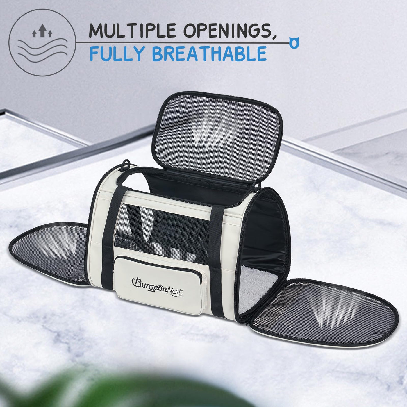 Burgeonnest Soft-Sided Pet Carrier Travel Bag For Cats Small Dogs Small Pet.1. Fashionable And Practical Design,Made Of High Quality Material.2. Wide And Thick Shoulder Strap, Reduce The Shoulder Stress, Make You Carry The Bag Easily. 3.Large Side Bag For Storage 4.Easy To Clean, Keep The Bag Tidy.