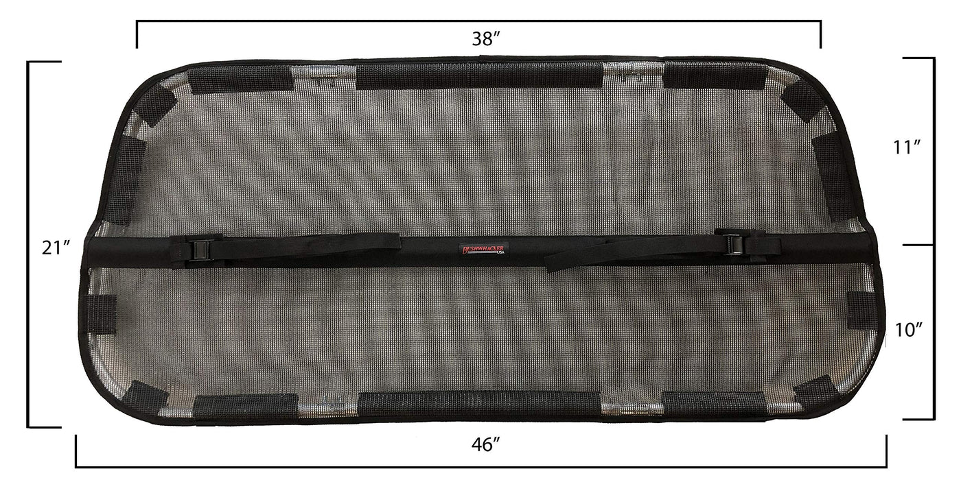 Q: What are the dimensions of the Bushwhacker Cargo Area Dog Barrier?A: The Bushwhacker Cargo Area Dog Barrier measures 46 inches wide by 21 inches high, making it an ideal fit for most CUVs and mid-sized SUVs.