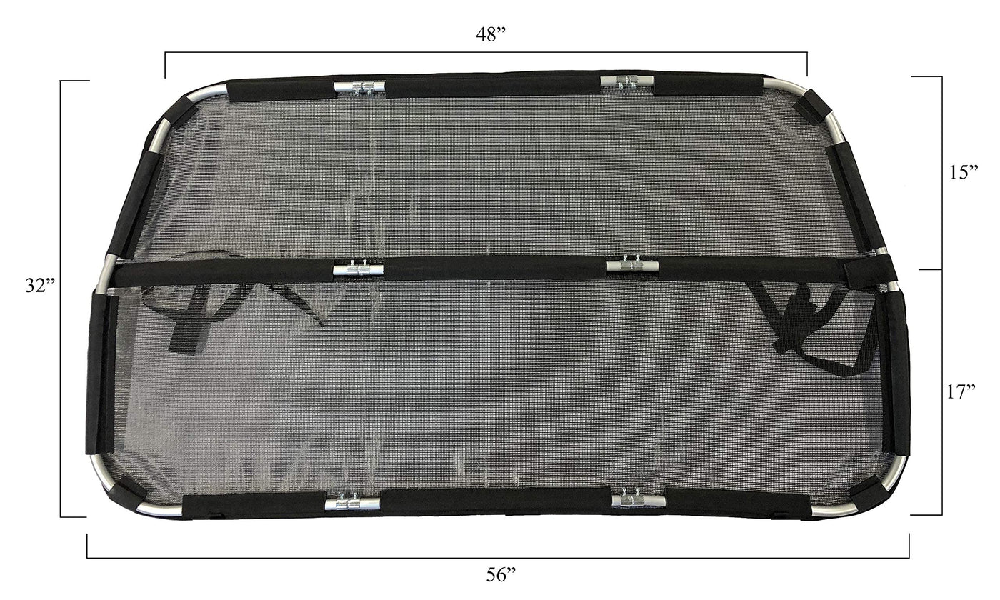 Keep your furry friend safe and secure while on the road with this Bushwhacker Dog Barrier. Designed specifically for SUVs, cars, and trucks, it serves as a pet fence and divider to keep your dog from jumping into the front seat or cargo area. Made with high-quality materials, this car barrier is durable and can withstand the wear and tear of regular use. With an easy installation process, it can be set up in no time. Suitable for dogs of all sizes, it provides a comfortable and secure space for your pet while traveling. Whether you're going on a long road trip or just running errands around town, this dog barrier is the perfect solution for keeping your furry friend safe and happy on the go. Dimensions: 56' x 32' Refer to second image for complete dimensions.