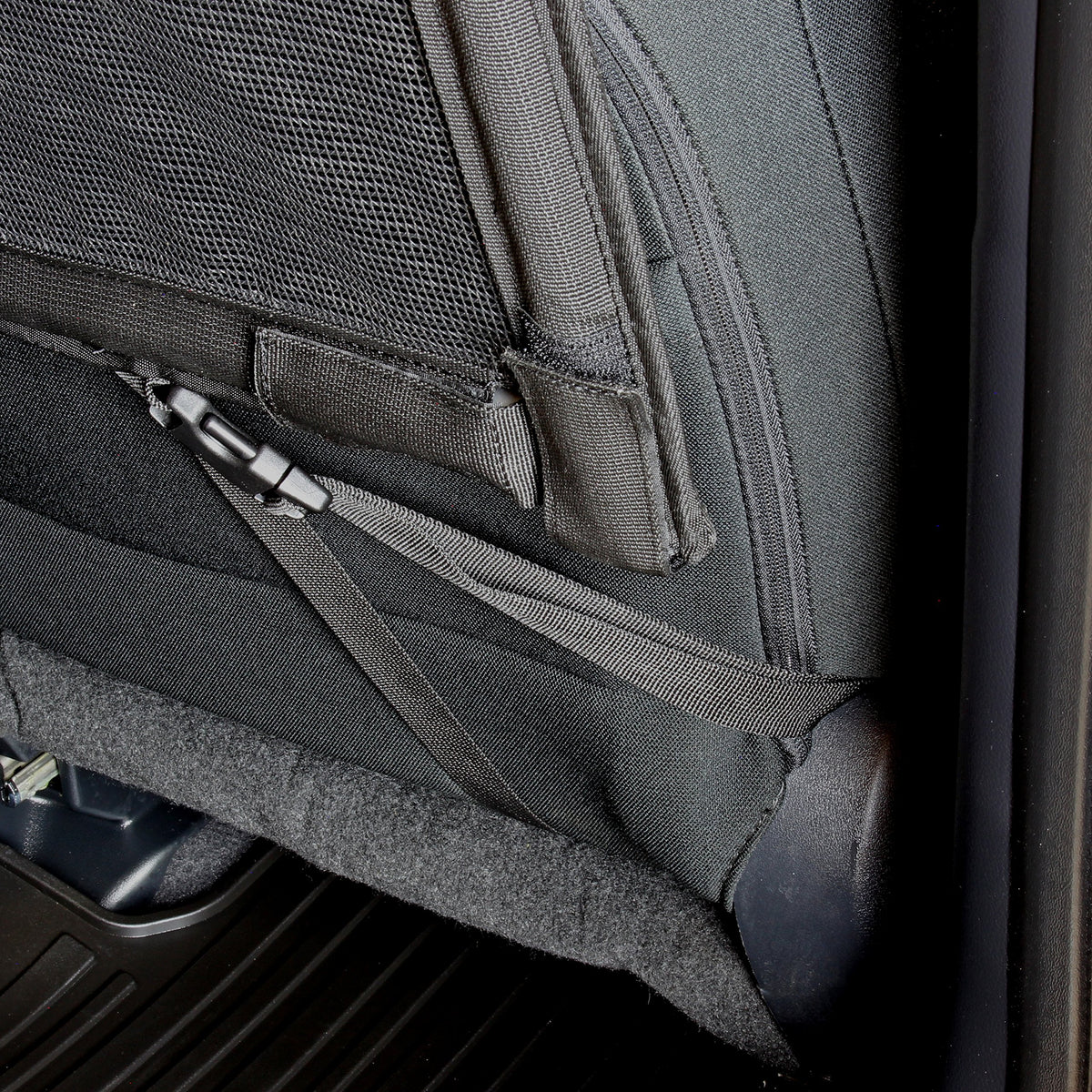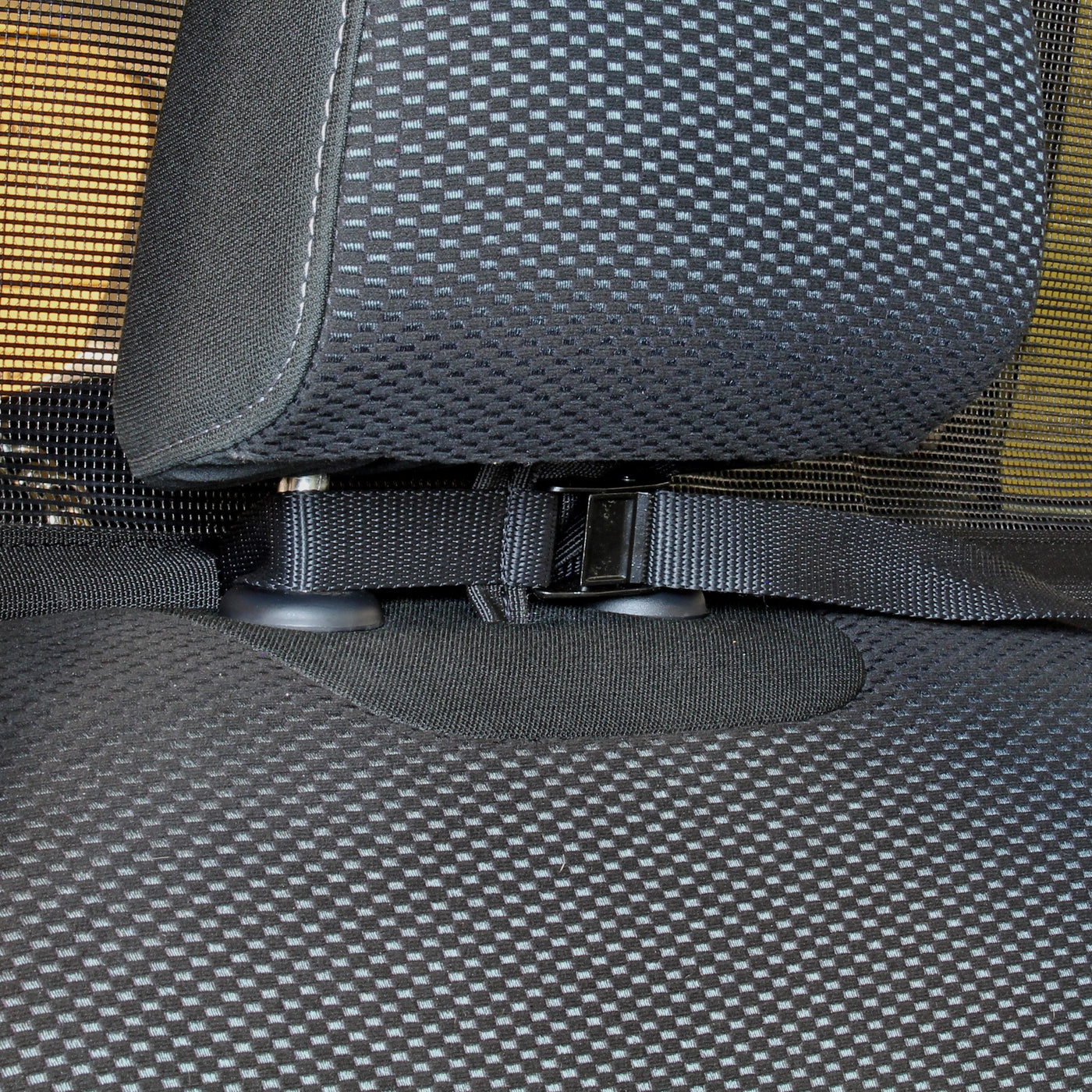 Q: How easy is it to install the dog barrier?A: Installing the Bushwhacker Deluxe Dog Barrier is simple and requires no tools. It easily attaches to the front seat headrests and secures to the seatbelt mount or car seat frame for a stable, non-slip fit.