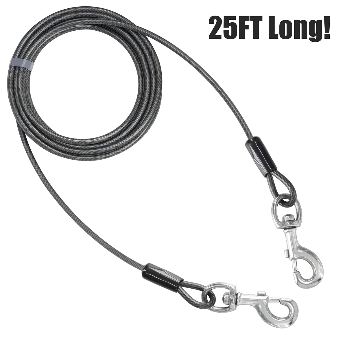 Q: How long is the BV Pet Tie Out Cable?A: This tie-out cable measures 25 feet in length, providing ample space for your dog to roam freely.
