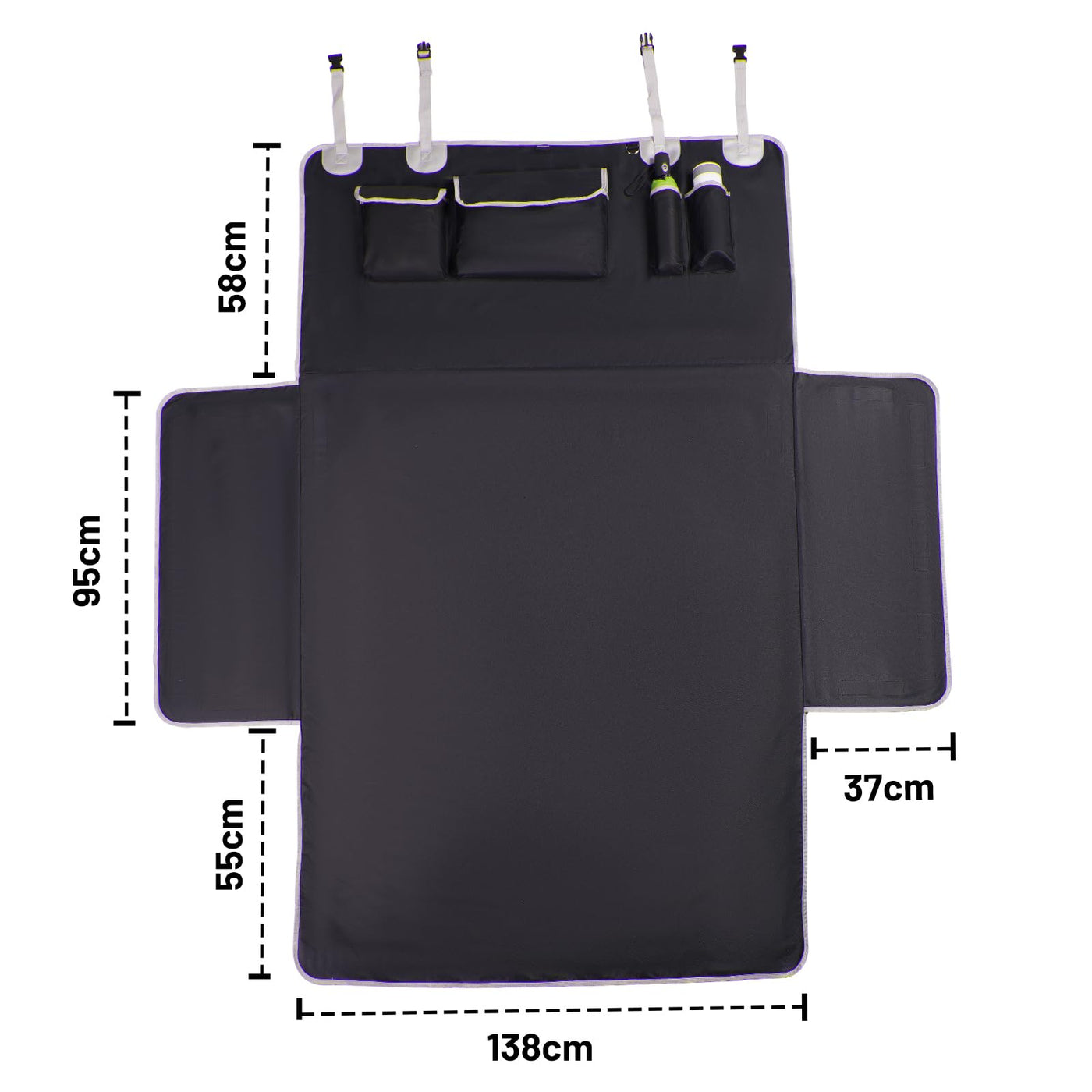 Made of 600D heavy-duty oxford fabric for longer durability,waterproof and stain resistant.Perfectly protect your car from scratches, water,mud or hair etc.By the way, please measure your vehicle cargo area for best fit. Large pocket for toys, leashes, bags or anything your pet may need! Our cover allows you to travel with your furry friend Just put 2 straps with quick release buckles on the seat headrest. If the product has any quality problems, please feel free to contact us, we will handle it for you right away If you have any questions about our products, please feel free to contact us