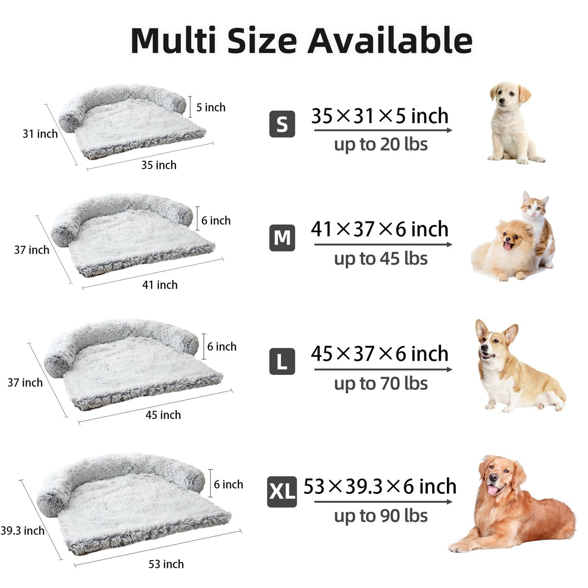 The couch pet bed has 5 sizes for you to choose from. XS: 31'x23.5' dog bed for small pets. S: 35“x31' dog bed for cats and small dogs. M: 41”x37' dog bed for medium dogs. L: 45“x37' dog bed for large dogs. XL:53'x39' dog bed for large dogs. We have enlarged the sleeping area for pets to give dogs more space.