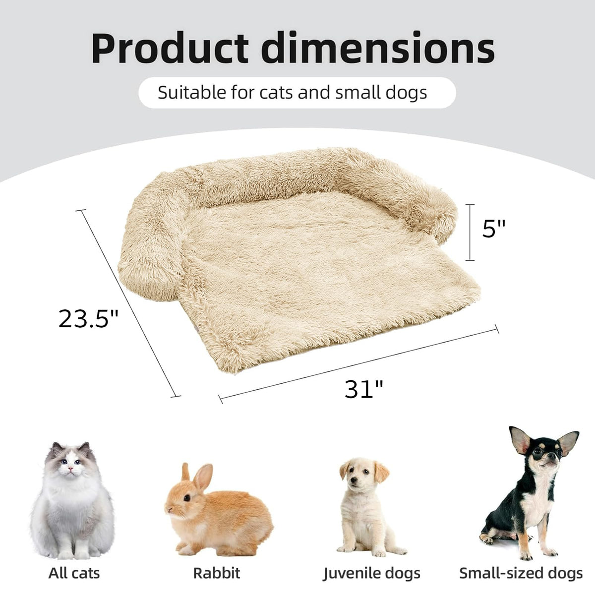The couch pet bed has 5 sizes for you to choose from. XS: 31'x23.5' dog bed for small pets. S: 35“x31' dog bed for cats and small dogs. M: 41”x37' dog bed for medium dogs. L: 45“x37' dog bed for large dogs. XL:53'x39' dog bed for large dogs. We have enlarged the sleeping area for pets to give dogs more space.
