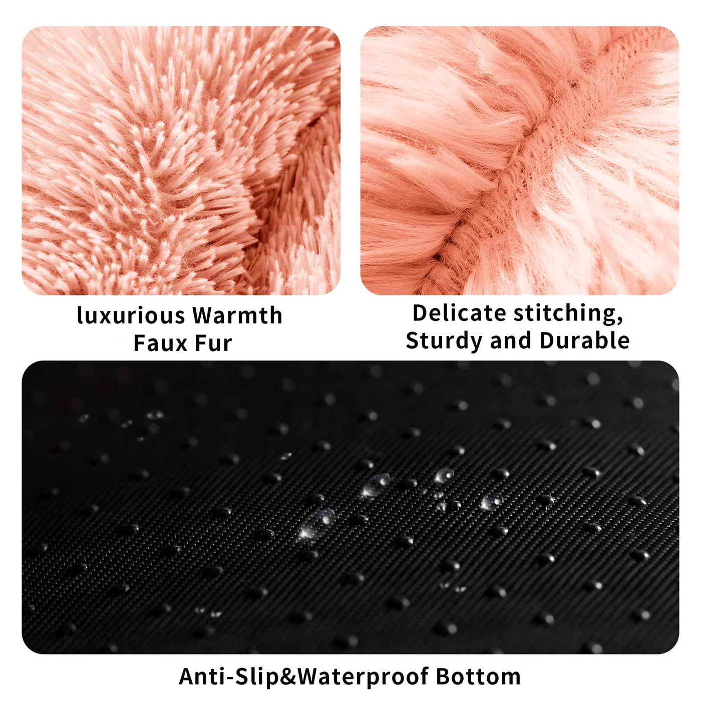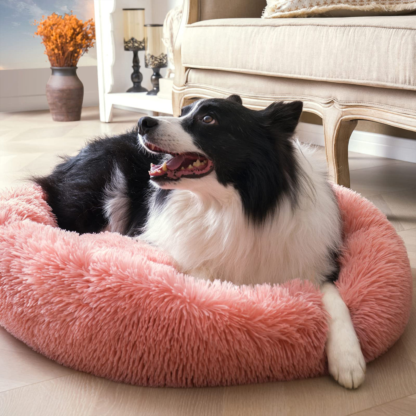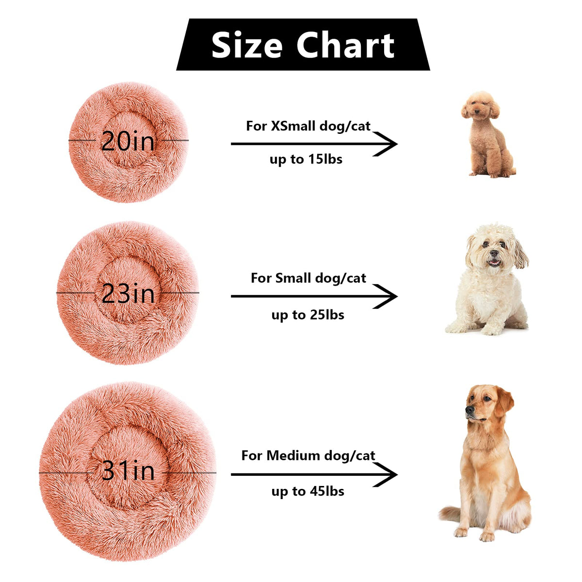 ET-SAFE MATERIALS- Our fluffy dog bed is made of long fluffy plush and enough PP cotton filling(Free from: flame retardants formaldehyde skin irritating chemicals harsh dyes) A warming luxury dog bed will keep your pet warm and cozy in cold night comfy & calming - Raised rim desigh provide head and neck support to ease the muscle soreness and joint pain for your loyal friend Our self-warming dog bed with donut cuddler shape creats a safe and warm room for large dogs who like to curl up and stretch to get a restful sleep (Not suitable for pet with excessive teething or chewing behavior) uti-size & Muti-color Options - The round dog beds comes in 5 size option: 2023273036 inch Best for pets up to 1525354590 lbs 5 color options: greyLight coffeeKhakiDark greyPink Find the right size and your favor color It also works great as a cat bed or a bed for all pets ultifunctional Bottom - This pet bed has an anti-slip PVc dot fabric bottom to stay in place on floors Your dog can play and rest securely in the calming dog bed And the waterproof bottom design effectively prevents the floor from getting dirty in case of an accident Easy to care - Our fuzzy dog bed can use washing machine Make sure that the bed is washed in cold water and gentle mode(no bleach) and thoroughly dried in low temperature please But we usually recommend hand washing to easy care for the plush dog bed Notice: Please leave it for a while after receiving the calming dog bed it will return to shape after shaking otice - Our cute dog bed is best gift for dogscats who love to curl up Dog bed is stored and shipped compressed rolled and vacuum sealed in a vacuum bag Please pat to make the dog bed completely fluffy before use wait for 48 hours patiently and manually adjust the dog bed to the desired shape We are always committed to do more professional dog bed to provide you the most satisfactory shopping experience Please contact us if you have any problem ood Service - We strictly control the quality to ensure that you and your pet friends are satisfied with your purchase If you have any questions please contact us We will definitely give you a satisfactory answer within 24 hours