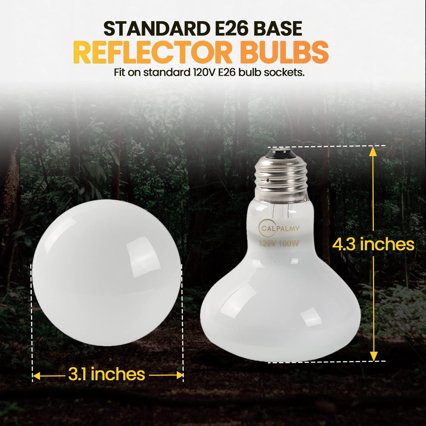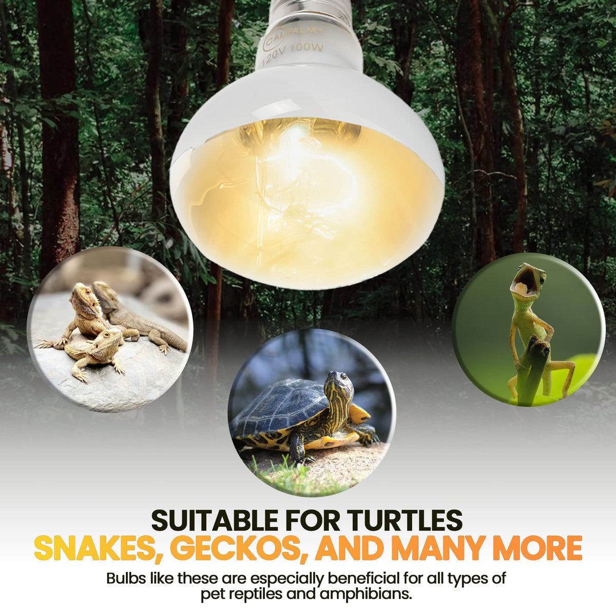 100W Turtle Basking Spotlight Safety Precautions Please observe these safety precautions before, during, and after using the 100W heat lamp bulbs: 1.The bulbs are not suitable for use on dimmers, thermostats, and rheostats. 2.Do not use the bulbs when you have a fluctuating power supply, causing unstable voltage 3.Only use high-quality and undamaged ceramic lamp sockets. 4.Advisable usage time is 4-6 hours per day. 5.Keep the heat bulbs away from water and avoid excessive moisture buildup. 6.Also, keep the heat bulbs at least a foot away from your pet reptiles or amphibians. 7.Wait for a few seconds or after the bulbs have considerably cooled down before turning it back on. Turning the bulb on and off constantly and in quick succession can shorten the bulbs lifespan. More Effective Than Regular Incandescent Bulbs These reflector bulbs are the perfect basking spot bulbs for your pet. They can produce a focused beam of light and heat that can create an efficient heat gradient so reptiles can thermoregulate to maintain a healthy body temperature. As an overhead radiant source, these reflector bulbs are conducive to reptile behavior, appetite, metabolism, and reproductive health. And when one bulb dies out, youll have 3 extra bulbs on hand.
