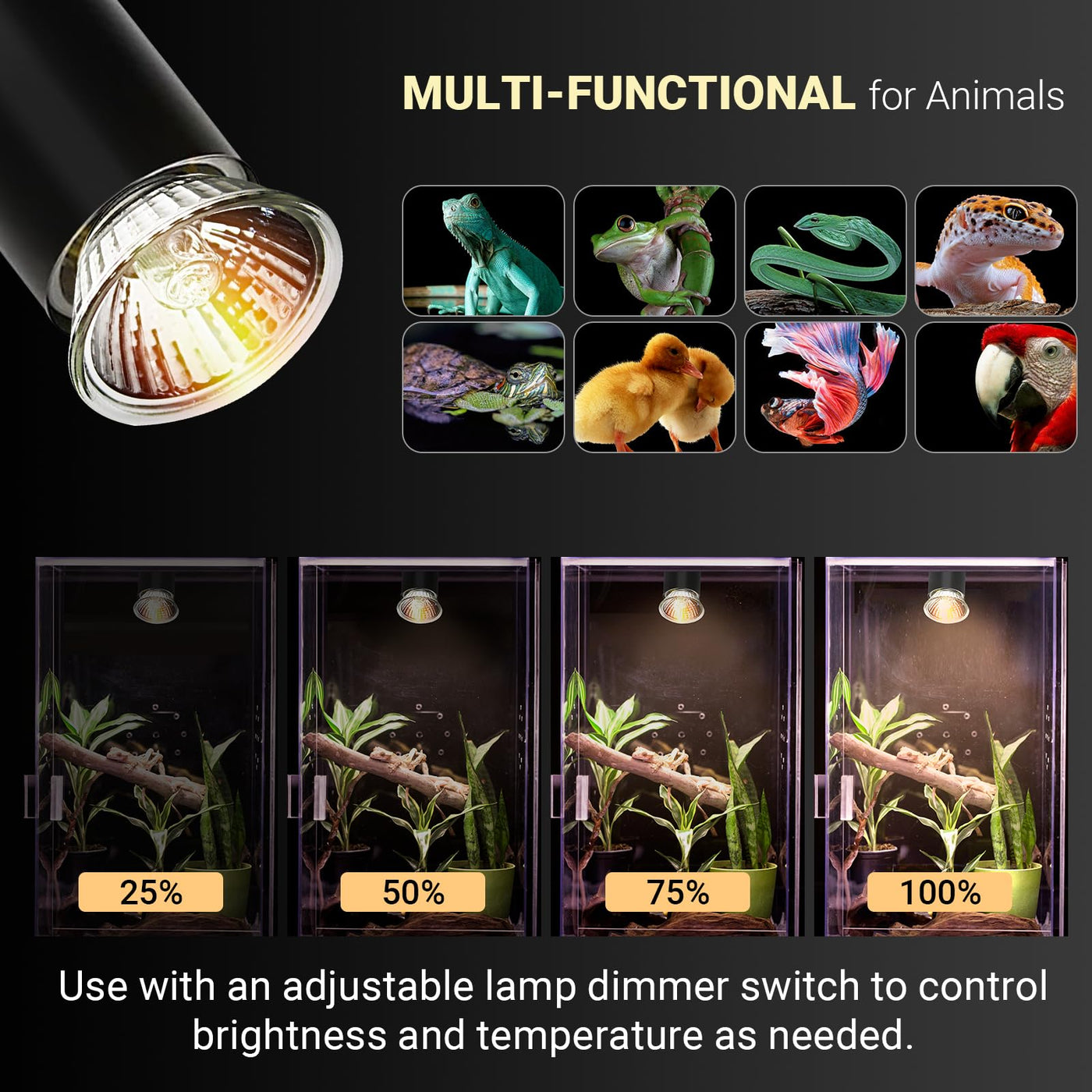 All reptiles generally need to bask in sunshine every day, at least for a few hours. UVA light for their metabolism, mood regulation as well as for breeding. UVB light helps their bones and other organs. Our 25w reptile light bulbs provide extra warmth and bright light to mimic sunshine and produce UVA and UVB lights. CE Certified: Safe materials give you ease of use and peace of mind. And, they work with Various Lamp Fixtures. Multi-functional for Animals or Extra Lighting: Use anywhere, from projects in your office to automotive hobbies in the garage. Or use with any animals cage, from snakes to fish and parakeets to frogs.
