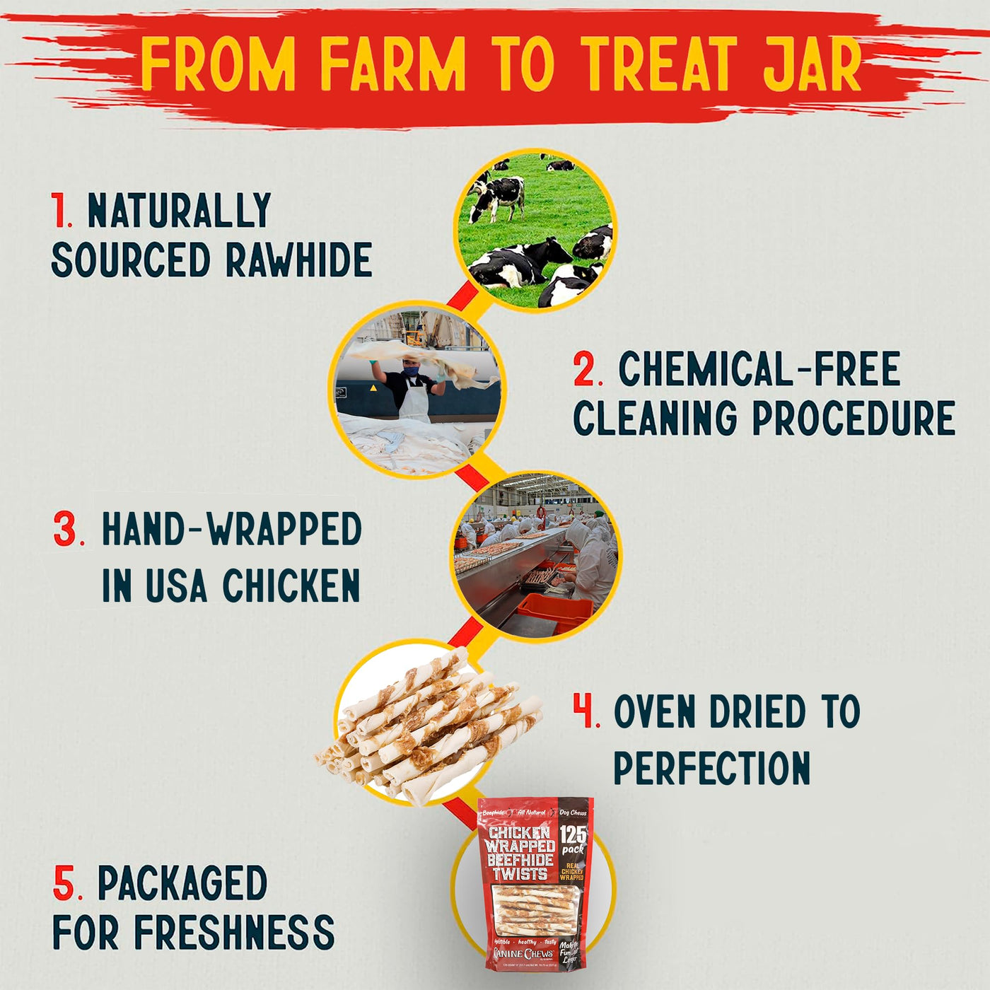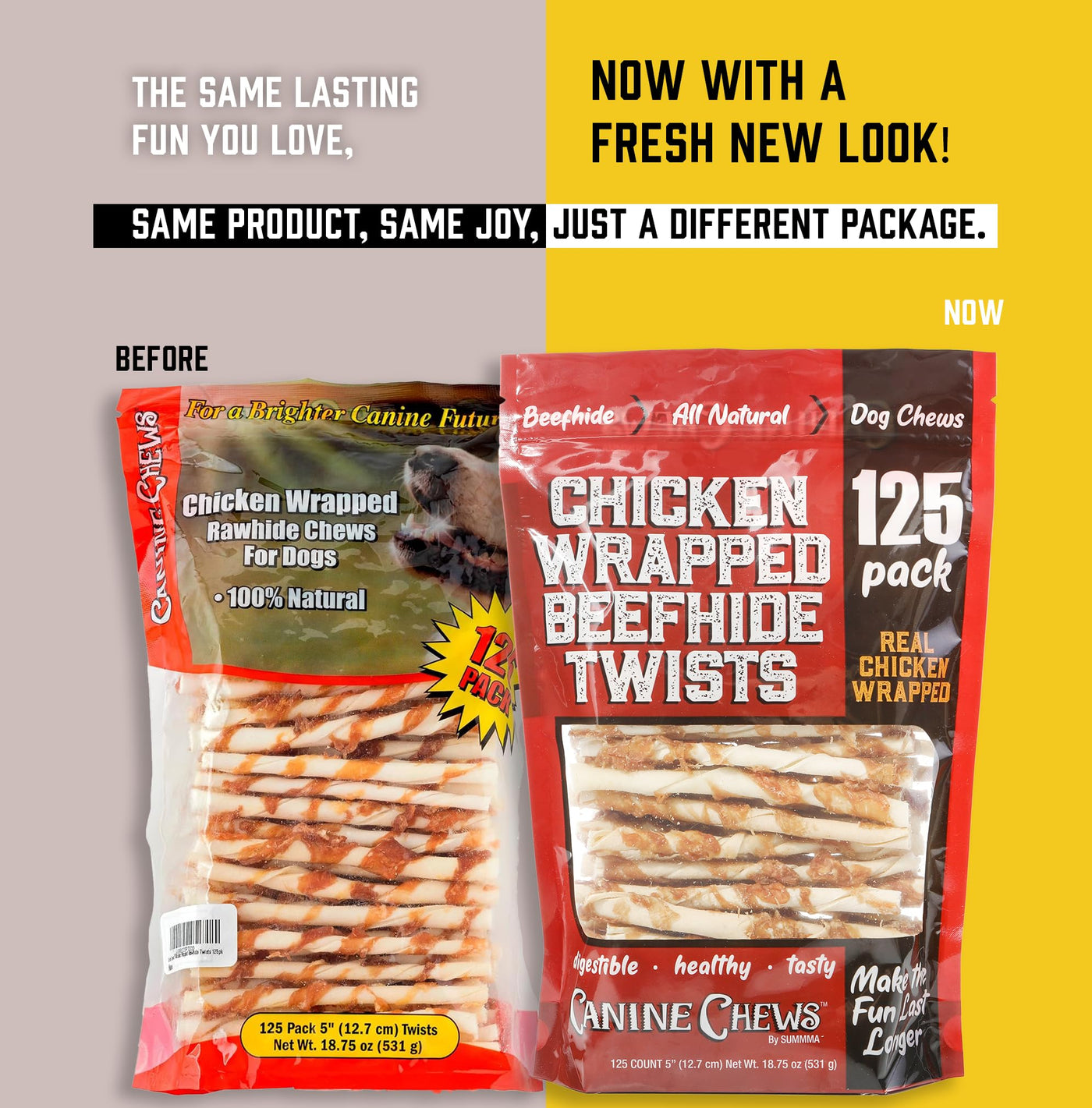Canine Chews Chicken-Wrapped Rawhide Twists for Dogs - Pack of 125 U.S.A. Sourced Chicken Wrapped Rawhide Dog Treats, Sticks for Dogs - Premium & Natural Beefhide Chews: Our 125 pack of rawhide chew sticks will satisfy your small and medium dogs natural urge to chew. Made from beef hide and wrapped with real whole-muscle chicken, these all natural dog chews have the great chicken taste your dog will love! Dental benefits abound: long-lasting twists clean teeth and support healthy gums by reducing plaque and tartar through a chewing action. Ideal for small and medium sized dogs, our chicken wrapped twists are your choice for an occupational chew. 125 pieces per resealable bag provide incredible value and will last your furry friend over 4 months at one per day! NEVER FROM CHINA, our rawhide is hand made in our family-owned factory in Mexico. With USA sourced chicken twists have two natural ingredients: chicken and beef. These savory snacks will be sure to have your small dog coming back for more!