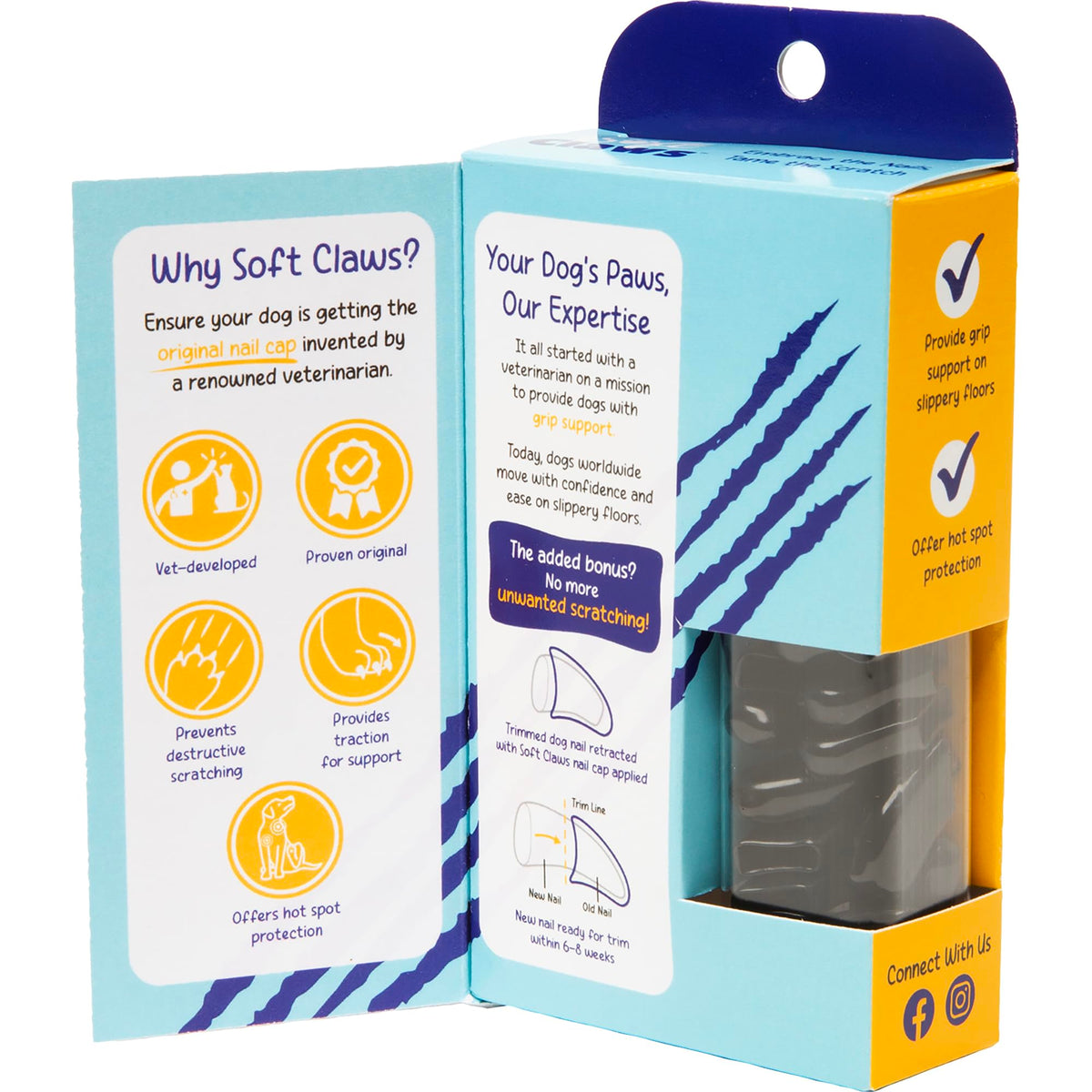 Canine soft claws nail caps take home kit helps customers protect their homes against destructive scratching by applying soft claws nail Caps to their pets' nails. A great add-on to your routine professional nail care. These easy-to-apply caps last 4-6 weeks and will not interfere with pet's normal behavior. The Canine starter kits are ideal for in-shop use. Canine take-home kit includes 40 nail caps, adhesive, 3 applicator tips and instructions. Available in large size and black color. Comes with 15-20-pounds weight, examples: westie, corgi, schnauzer. Measures 9-inch length by 7-2/7-inch width by 3-1/2-inch height.
