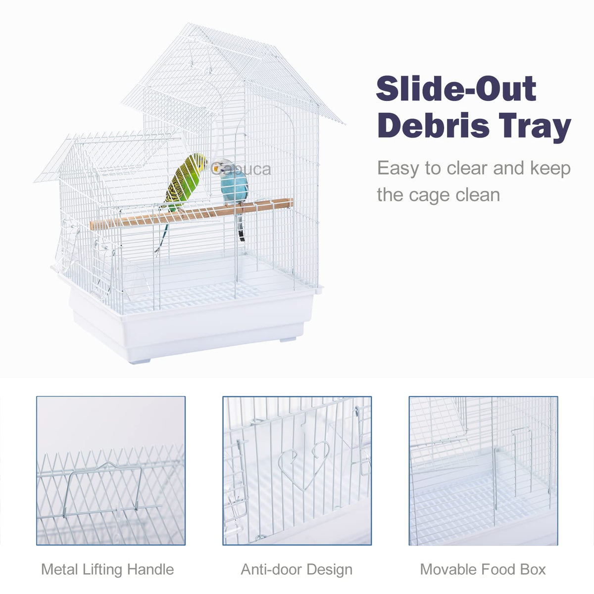 The lightweight and strong Travel birdcage is ideal solution for short-term traveling walking camping or vet with your bird. A removable bottom grille and plastic pull out tray make cleaning effortless while storage is simple as you can fold the cage flat.