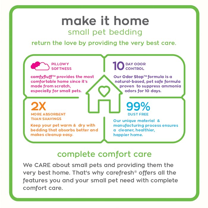Specifically designed for small pets, carefresh pet bedding is sustainably made from scratch with pillowy-soft, ultra-absorbent natural paper fiber. Whether filling a hamster's home or looking for the perfect guinea pig bedding, our natural small animal bedding provides your pet with a soft, safe, clean and dry place to burrow, nest, and nap. Free of harmful chemicals and synthetic dyes, this 99% dust-free high performance bedding is also biodegradable and compostable, meaning clean-up is always quick and easy while ensuring a cleaner, healthier home for your furry friend. Treat your beloved pet to the bedding of choice for guinea pigs, rabbits, hamsters, gerbils, rats, mice, chinchillas and ferrets. carefresh only uses reclaimed paper fiber and untreated wood from sustainable sources, free of harmful chemicals and other pollutants, and we've been doing it proudly for over 30 years. Variations in product, color, texture and size can occor due to our commitment to using sustainable practices to protect the future of our planet.