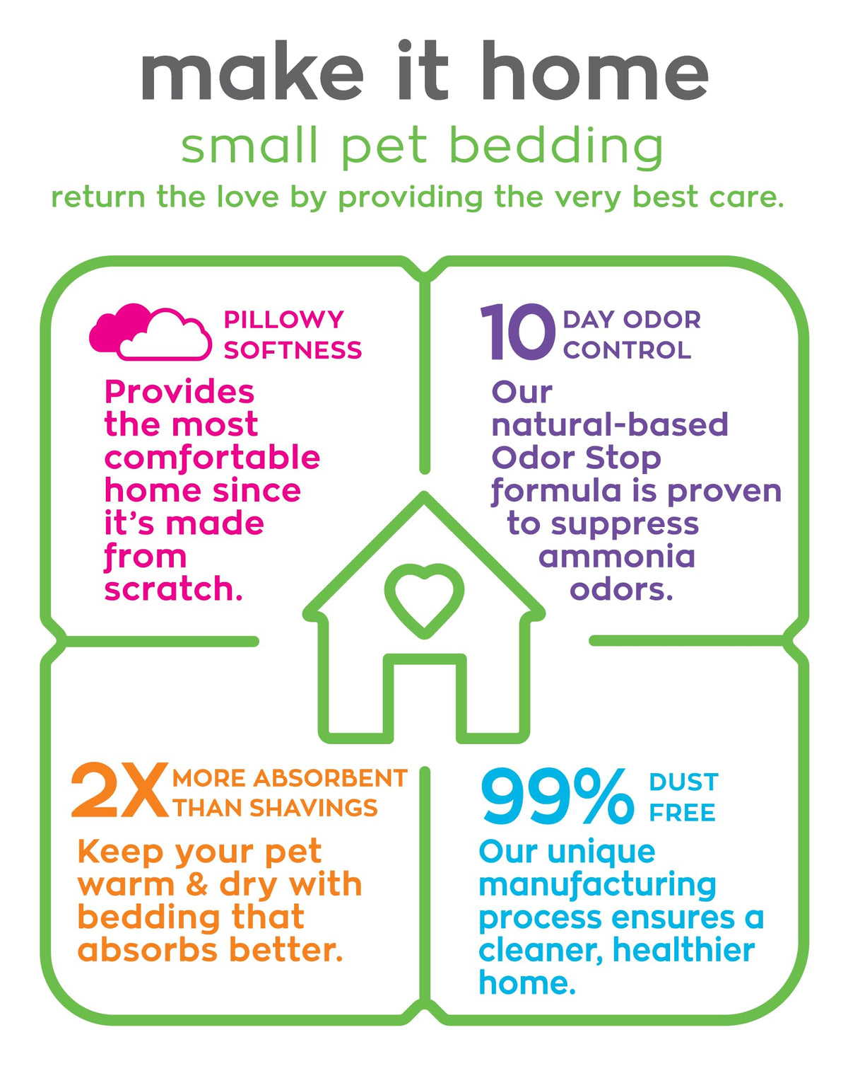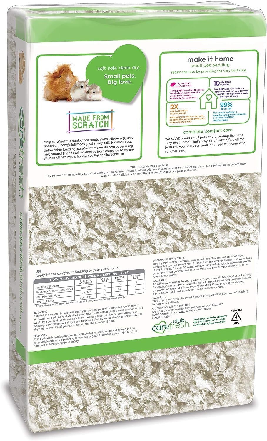 Specifically designed for small pets, carefresh pet bedding is sustainably made from scratch with pillowy-soft, ultra-absorbent natural paper fiber. Whether filling a hamster's home or looking for the perfect guinea pig bedding, our natural small animal bedding provides your pet with a soft, safe, clean and dry place to burrow, nest, and nap. Free of harmful chemicals and synthetic dyes, this 99% dust-free high performance bedding is also biodegradable and compostable, meaning clean-up is always quick and easy while ensuring a cleaner, healthier home for your furry friend. Treat your beloved pet to the bedding of choice for guinea pigs, rabbits, hamsters, gerbils, rats, mice, chinchillas and ferrets. carefresh only uses reclaimed paper fiber and untreated wood from sustainable sources, free of harmful chemicals and other pollutants, and we've been doing it proudly for over 30 years. Variations in product, color, texture and size can occor due to our commitment to using sustainable practices to protect the future of our planet.