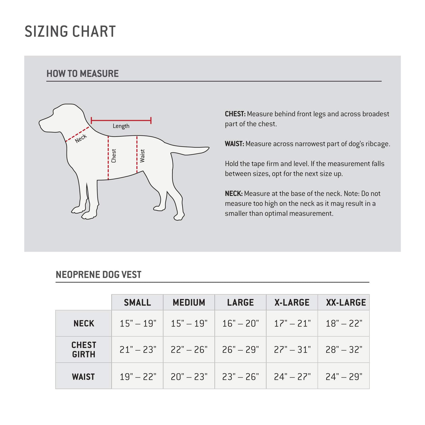 carhartt Neoprene Dog Vest Heavy-duty nylon vest for hard-working hunting dogs A good waterfowl dog doesnAt think twice about plunging into freezing water so your dog needs a neoprene vest to keep their core temperature up 3mm Neoprene provides a comfortable fit and added warmth Polyester Stretch bonded to padded material with durable stretch liner Easy grab handle holes D-ring for quick leash attachment Heavy duty nylon stitching with seam bar tacks for cut to fit adjustability Internal webbing harness for better structure and stability when lifting out of water Additional protective flexible underbelly plate adds extra protection in vital area to guard against sticks and rocks color reflective logo Adjustable hook and loop shoulder and back closures for a perfect fit Sizing: Small (chest girth 21-23) Medium (chest girth 22- 26) Large (chest girth 23- 26) X-Large (chest girth 24- 27) XX-Large (chest girth 28- 32)