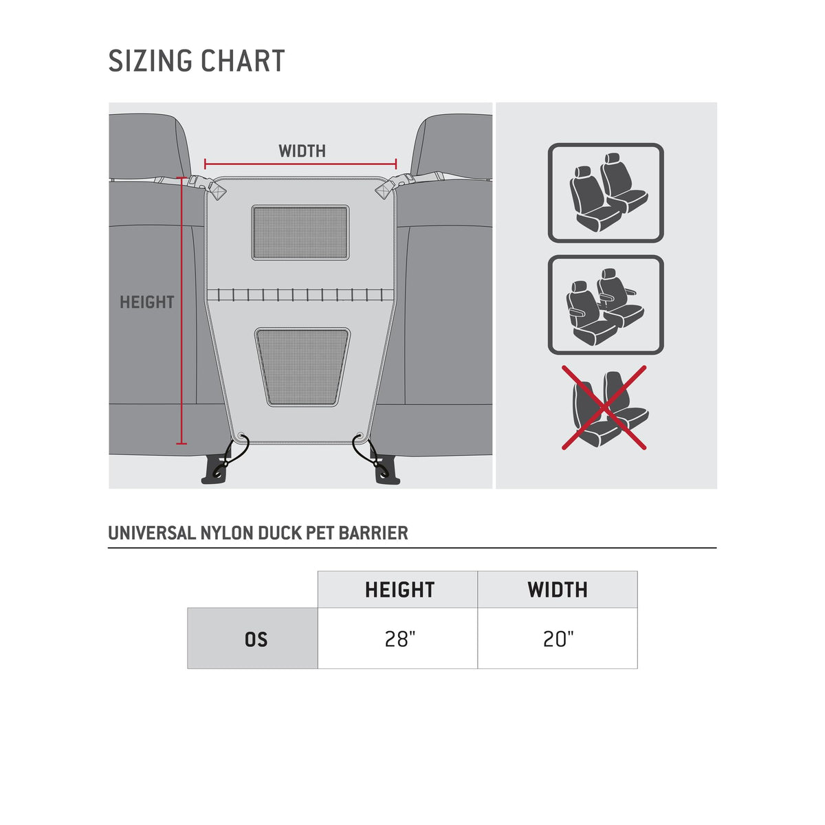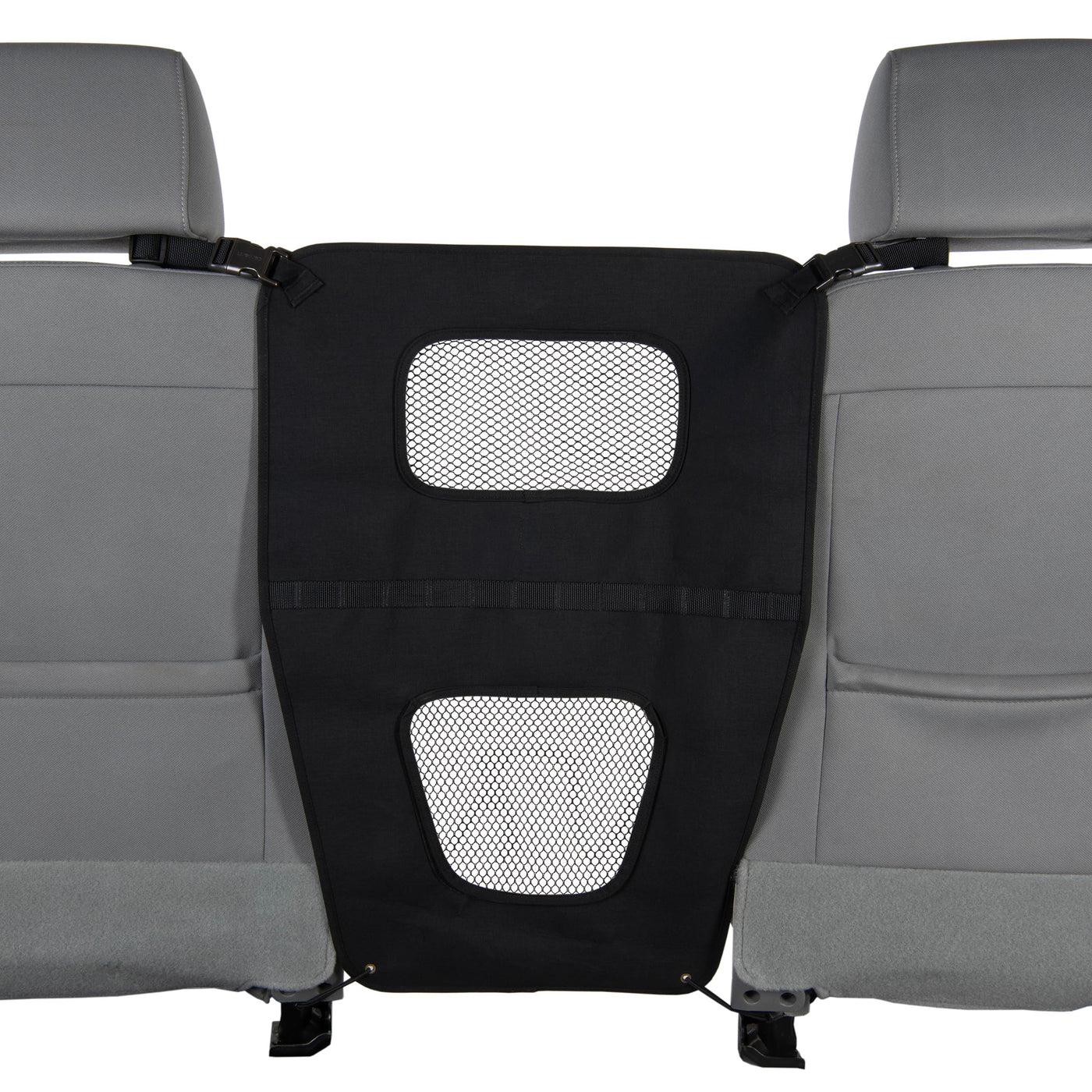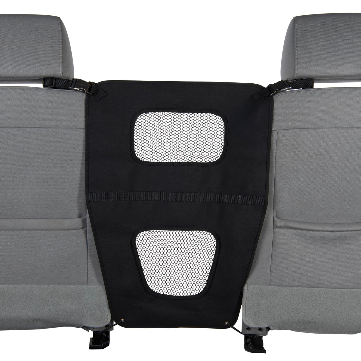 Keeps pet from jumping in front seats. Barriers allow for air and seeing pets. Bottom panel opens for access to control panels. Buckles around headrests and secures to seat bottoms. Durable 500D nylon duck weave with Rain Defender