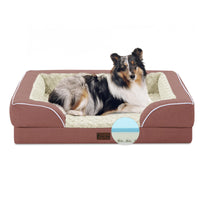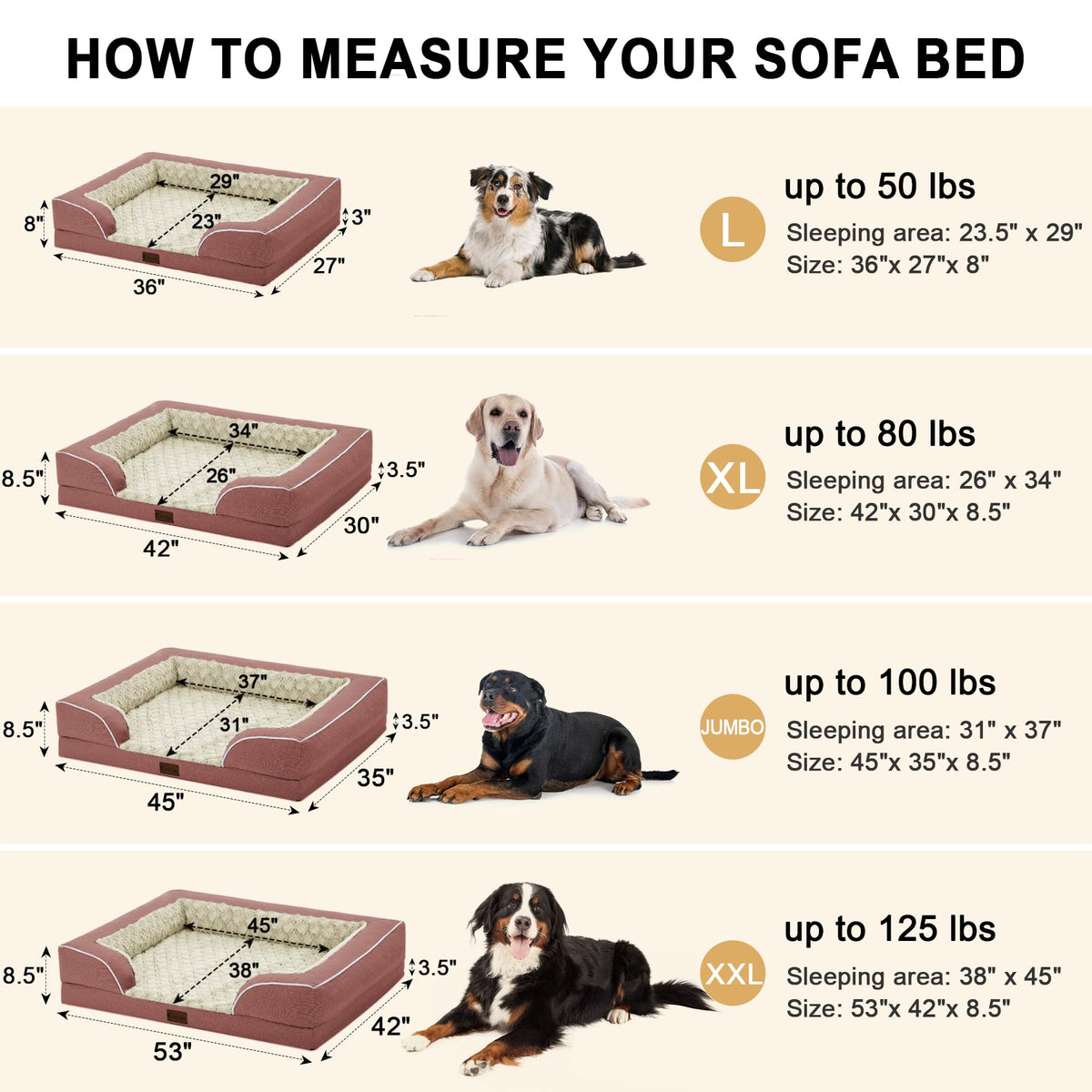 DOG SOFA SIZE: Large dog beds 36'' x 27'' x 8''(3'' Base+5'' Bolster; Sleep Surface: 23.5'' x 29'')for pets up to 50lbs. Due to the dog couch bed arrives as a vacuum-packed bed in a box please unpack and leave in air for about 48 hours the dog bed will spring back and fill up.