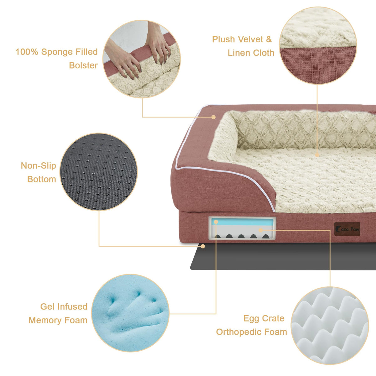 Q: What materials are used in Casa Paw Orthopedic Dog Beds?A: Casa Paw Orthopedic Dog Beds are made with a combination of gel-infused memory foam and egg crate foam, providing optimal support and comfort for large dogs. The soft sleeping surface is covered with plush velvet, ensuring a gentle feel for your pet's nose and paws.