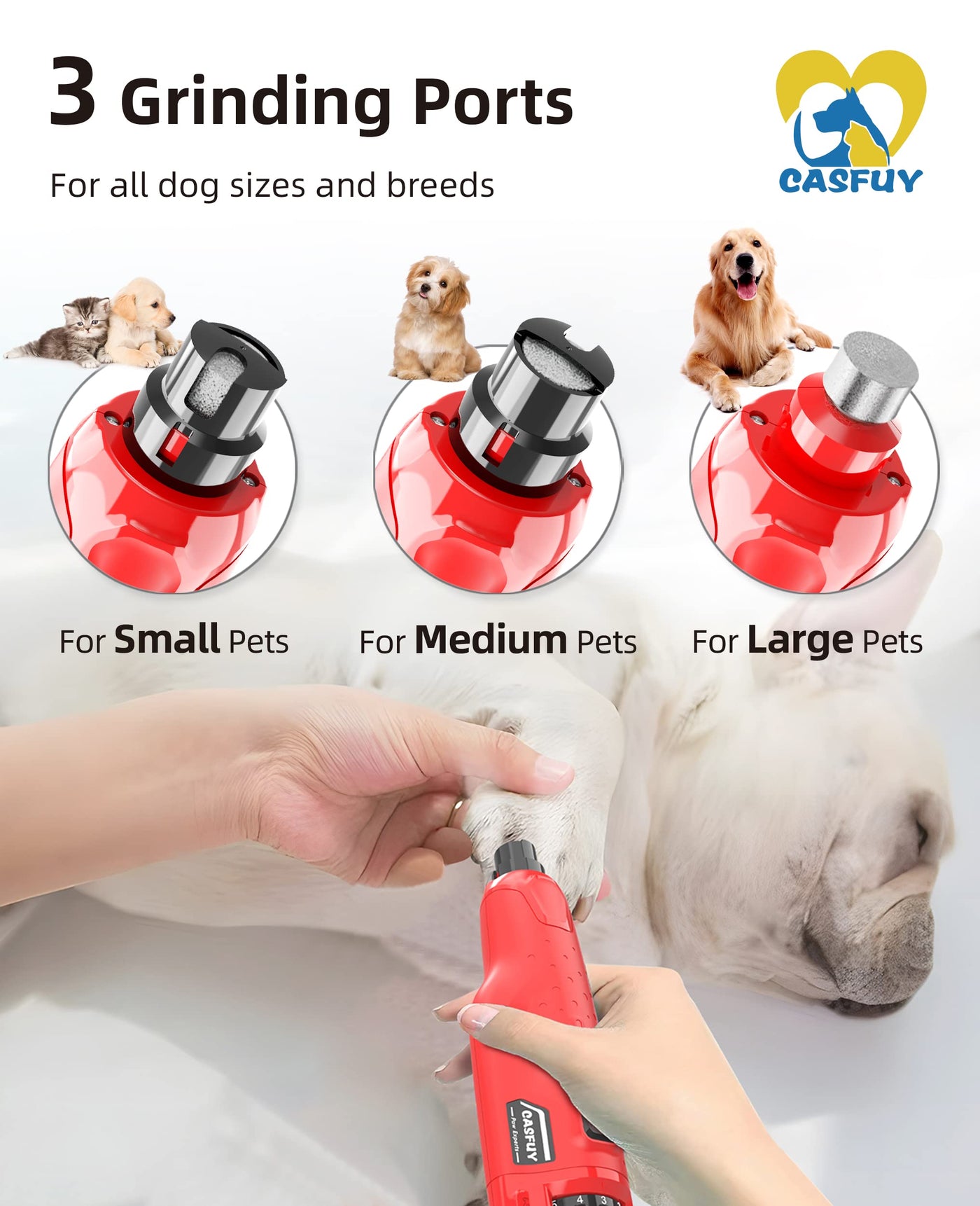 6 adjustable speed(7000-12000RPM) user-friendly to both experienced and novice user: casfuy dog nail grinder Offers six adjustable grinding speeds Turn off the nail grinder using power switch directly to ensure your preferred speed are saved and ready for future use 3 grinding ports to groom with precision and ease: casfuy dog nail trimmer has 3 ports Small port is specifically designed for small pets medium one is for medium-sized ones and unprotected nail grinder works best with larger dogsA nails 2 built-in LED lights avoid over-trimming: 2 LED lights of casfuy pet nail grinder give clarity to the grooming session helping you find the quick and avoid hurting pets It can be easily recharged with Ac adapter laptop or other power source It lasts up to 4 hours on a full charge Low vibration gentle and quiet: comes with advanced diamond bit casfuy quiet nail grinder delivers low vibration making it a gentle and quiet grooming tool that dogs of all sizes can enjoy offering your pet a comfortable and stress-free grooming experience Removable plastic sheath makes cleanup easier: A removable plastic sheath fits around the grinding bit of casfuy dog nail grinder allowing you to easily collect and dispose of nail dust and debris while groom The tidiness resulting from the sheath is a solid bonus